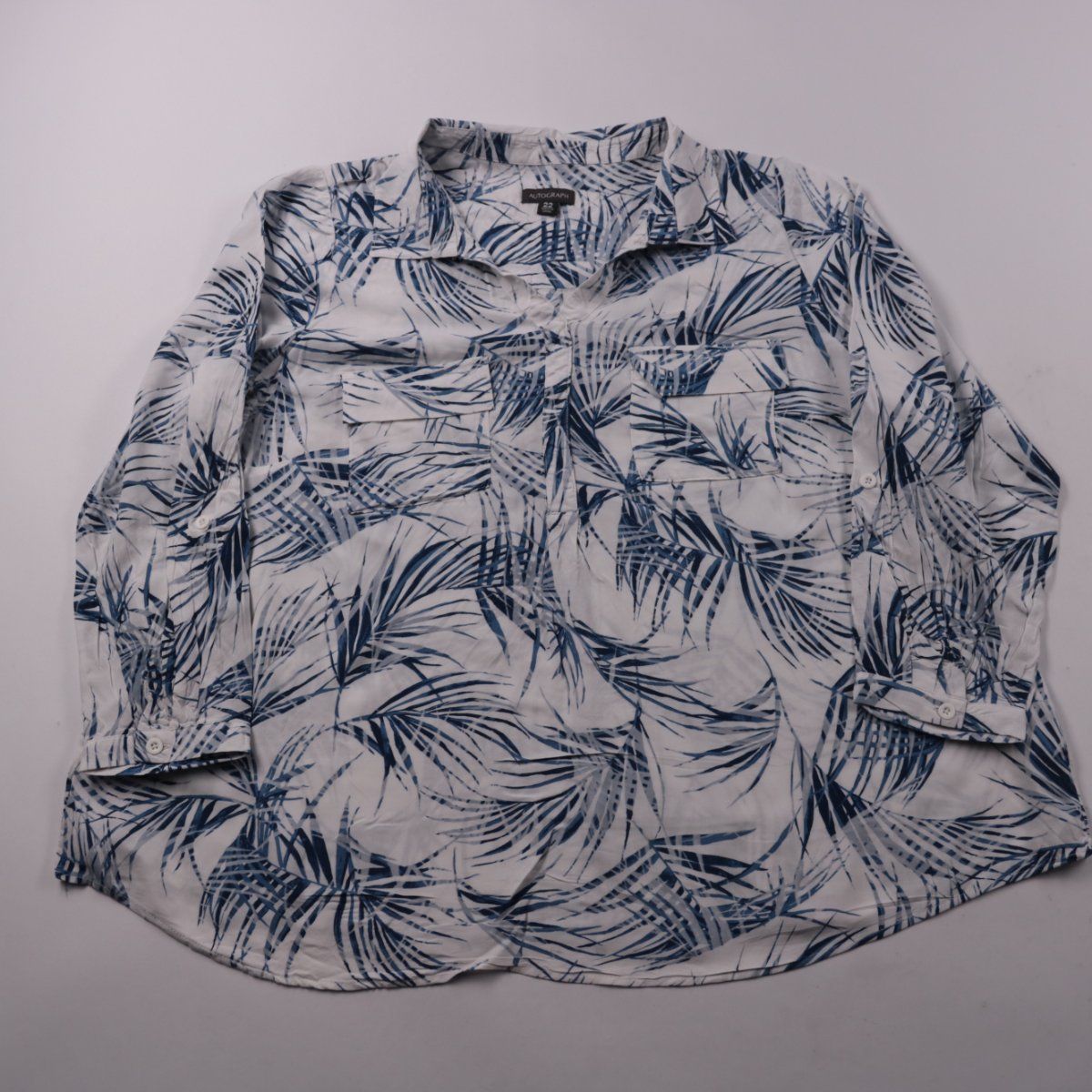 Женская рубашка Autograph из 100% вискозы с принтом в виде листьев в сине-белой гамме. Подойдёт для тёплой погоды и отпускных образов с джинсами или шортами. Ткань лёгкая и хорошо дышит, поэтому комфортна в носке.