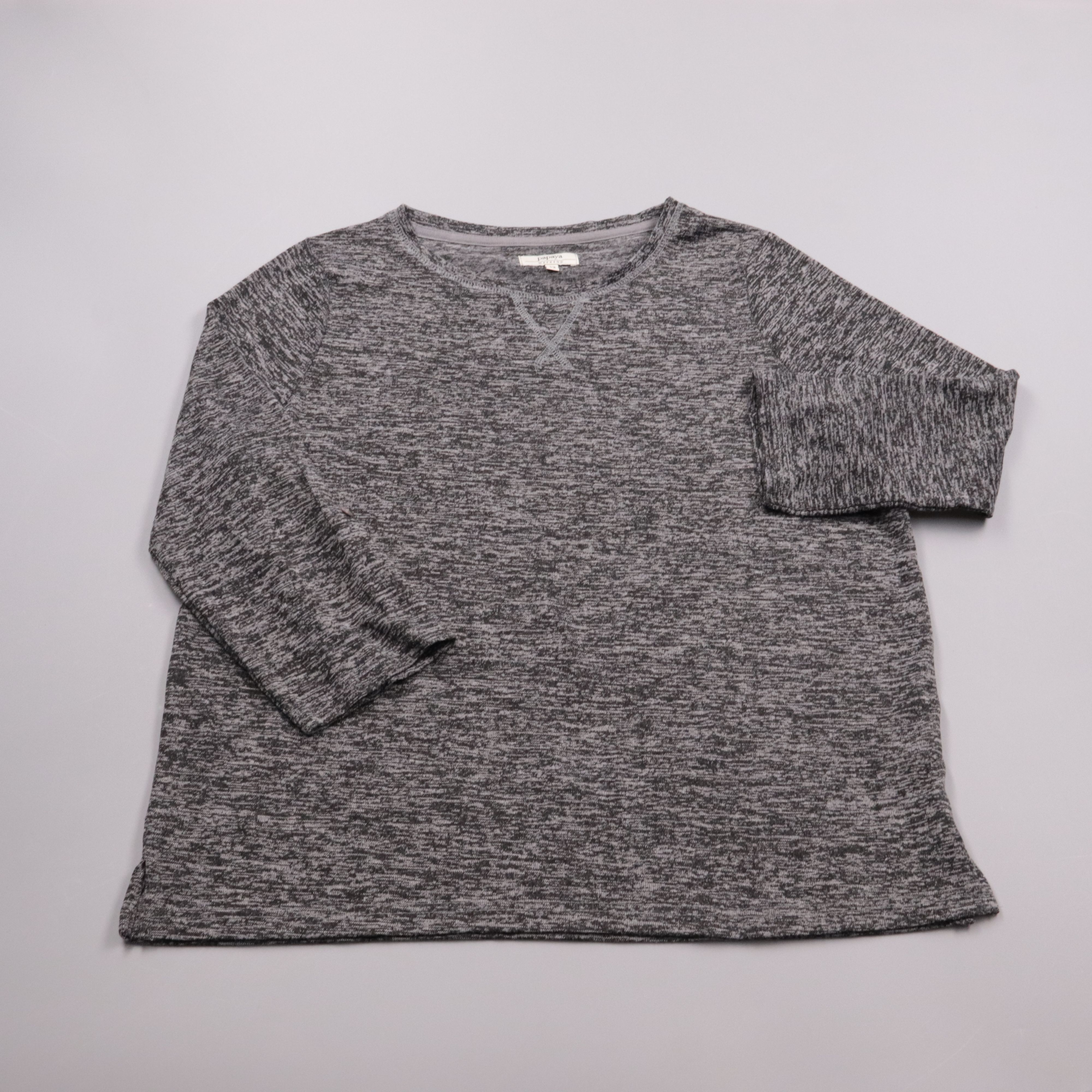 Свитшот Papaya Weekend серого меланжевого цвета, прямого кроя с круглым вырезом. Подойдёт для повседневных образов и в качестве уютного слоя в прохладную погоду. Практичный материал почти не мнётся и легко стирается.