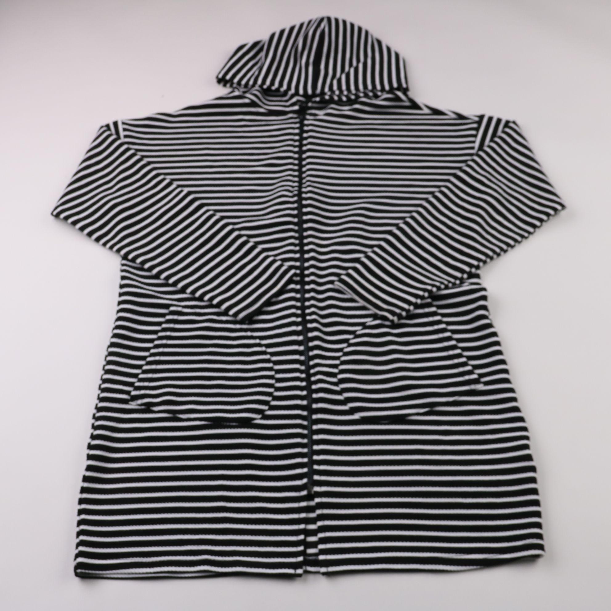 Демисезонная куртка в чёрно-белую полоску на молнии, с капюшоном и карманами. Подойдёт для прогулок в прохладную погоду весной и осенью. Материал эластичный и не сковывает движения.