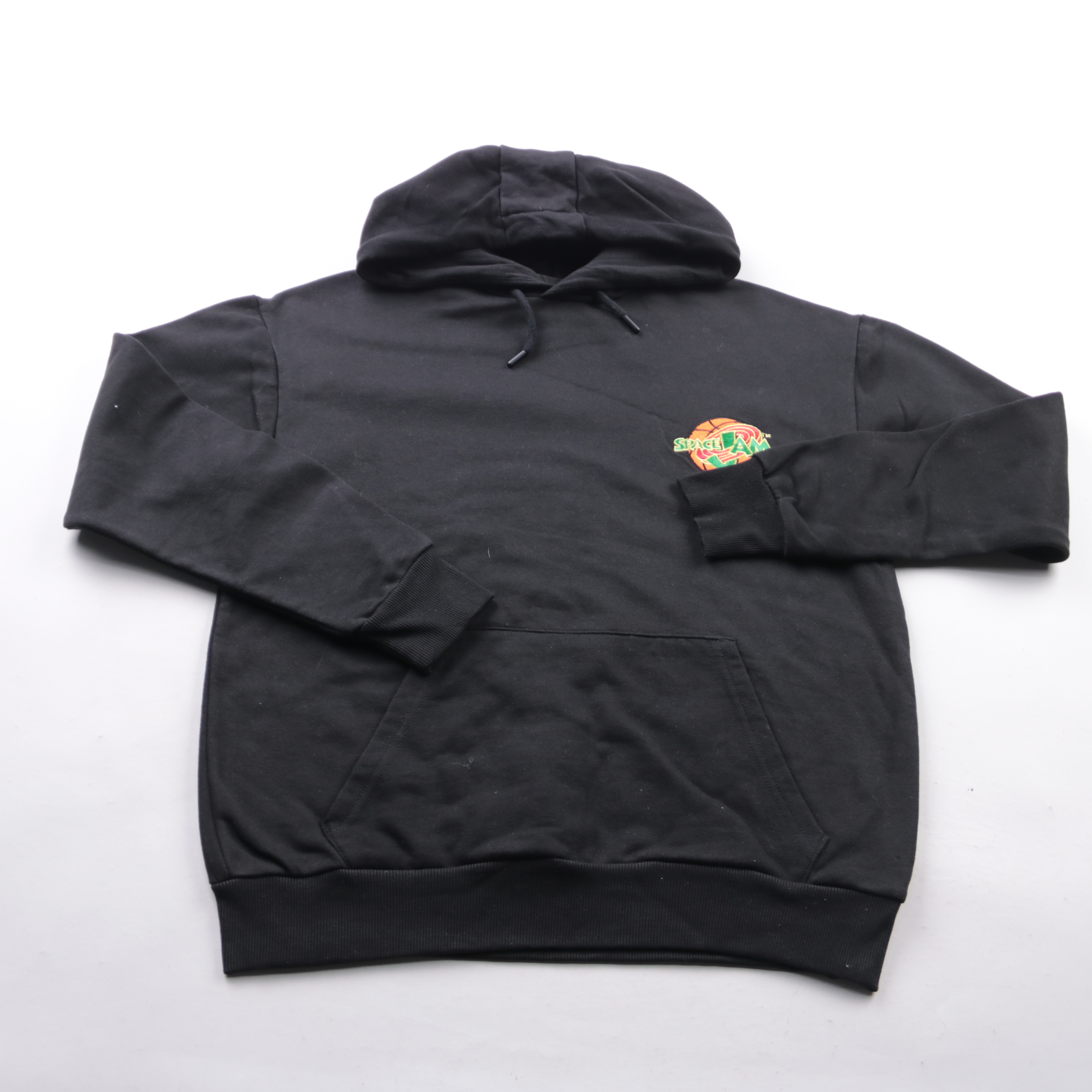Толстовка Primark чёрного цвета с капюшоном и карманом-кенгуру, на груди небольшой принт Space Jam. Подойдёт для повседневных прогулок и уютных образов в прохладную погоду. Мягкий футер с хлопком приятен к телу и хорошо держит форму.