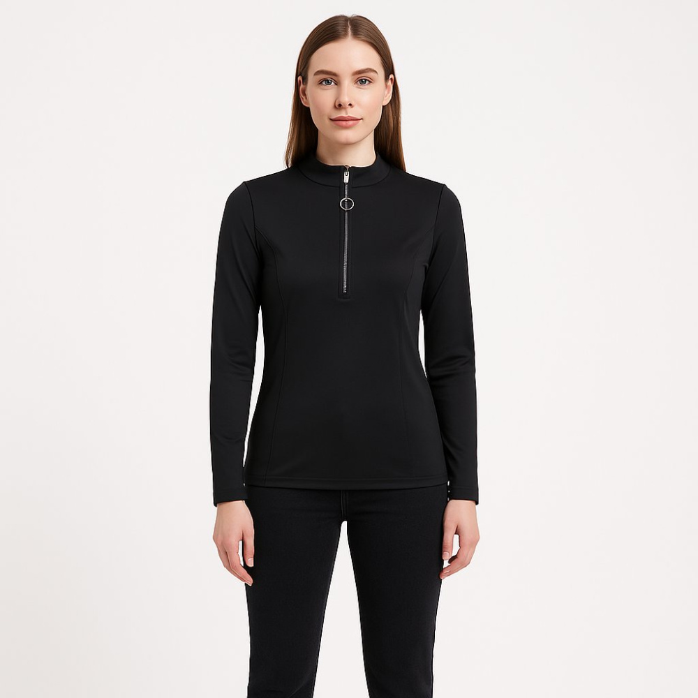 Женская кофта George чёрного цвета с высоким воротником и короткой молнией спереди. Подойдёт для тренировок, прогулок и как базовый слой в прохладную погоду. Практичный плюс — эластичный материал хорошо тянется и не сковывает движения.
