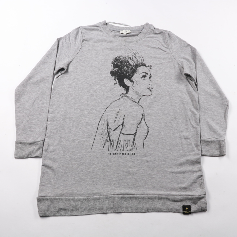 Женский свитшот C&A серого меланжевого цвета с принтом Tiana. Подойдёт для повседневных образов в прохладную погоду, хорошо сочетается с джинсами и кедами. Мягкий трикотаж тянется и комфортно сидит за счёт эластана.