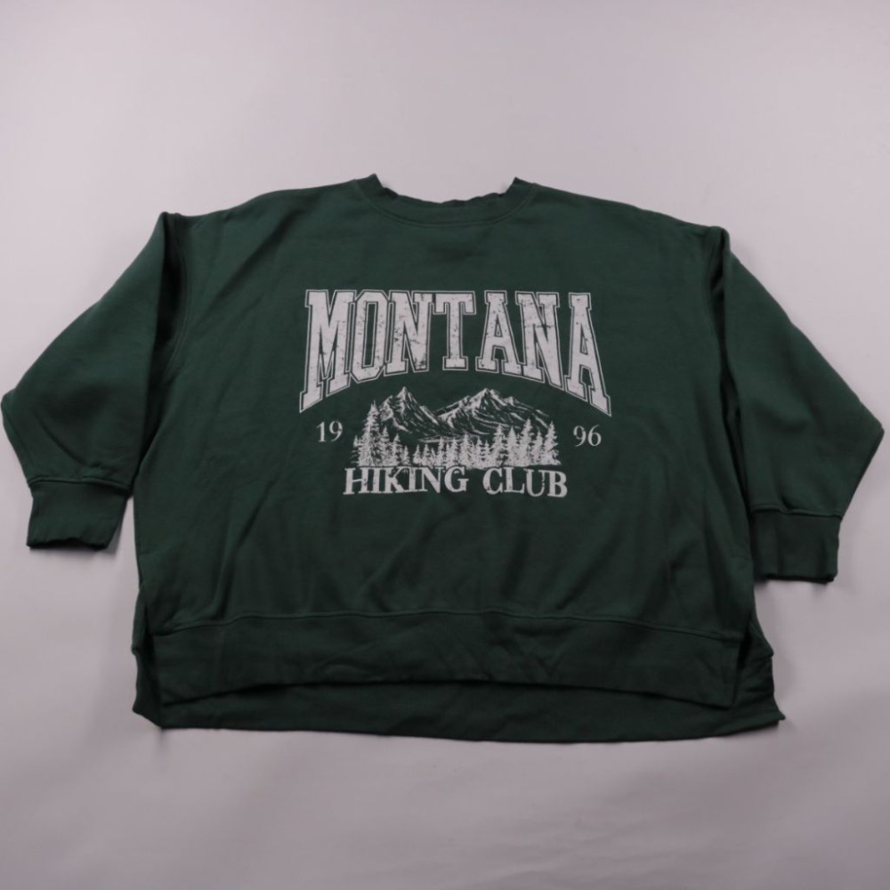 Женский свитшот Primark Cares тёмно‑зелёного цвета с принтом Montana Hiking Club. Подойдёт для прогулок и повседневных образов в демисезон. Мягкая изнанка делает его тёплым и комфортным в носке.