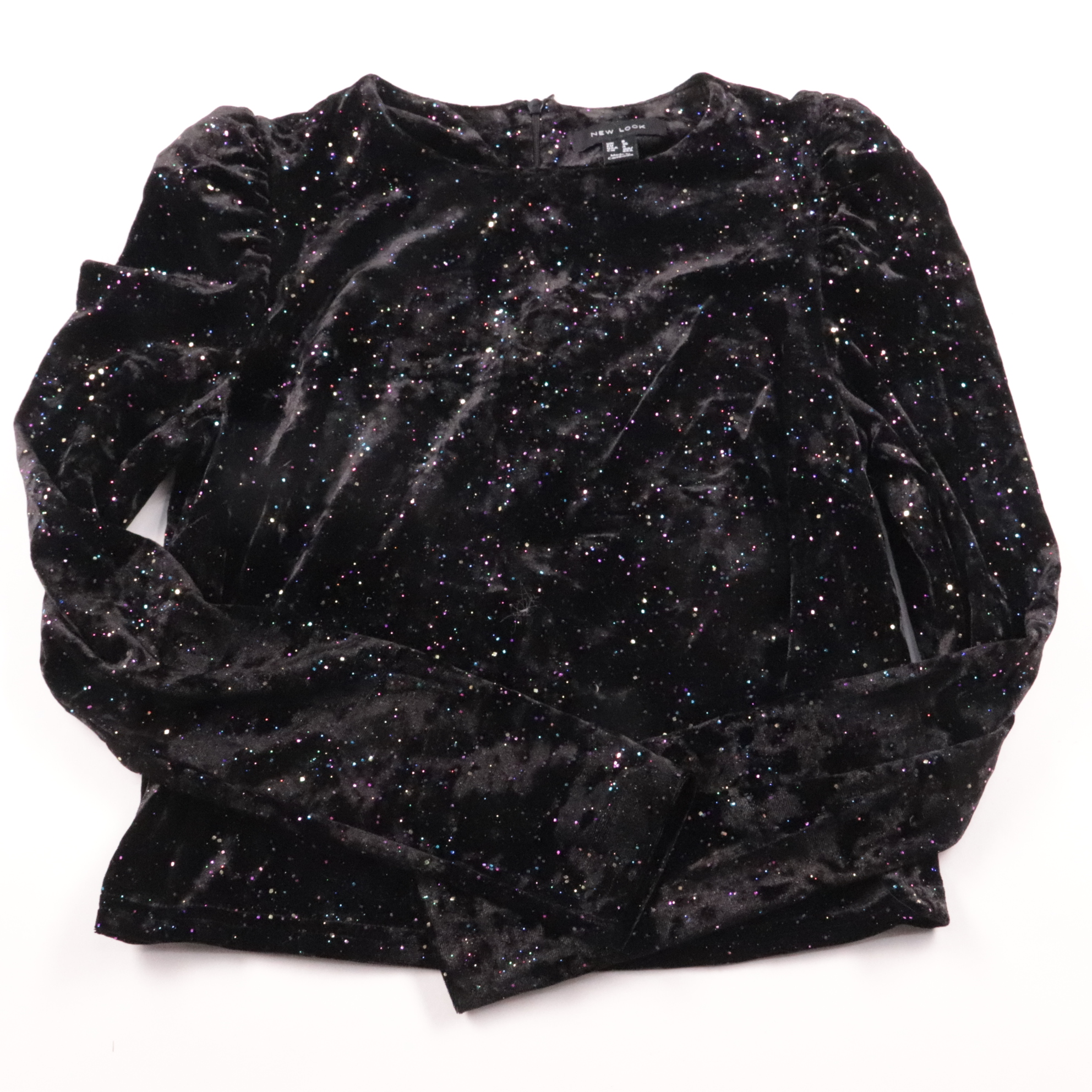Бархатный лонгслив New Look чёрного цвета с блёстками и слегка присборенными рукавами. Подойдёт для вечерних выходов и праздников, когда хочется акцента в образе. Мягкая ткань приятна к телу и комфортно сидит.