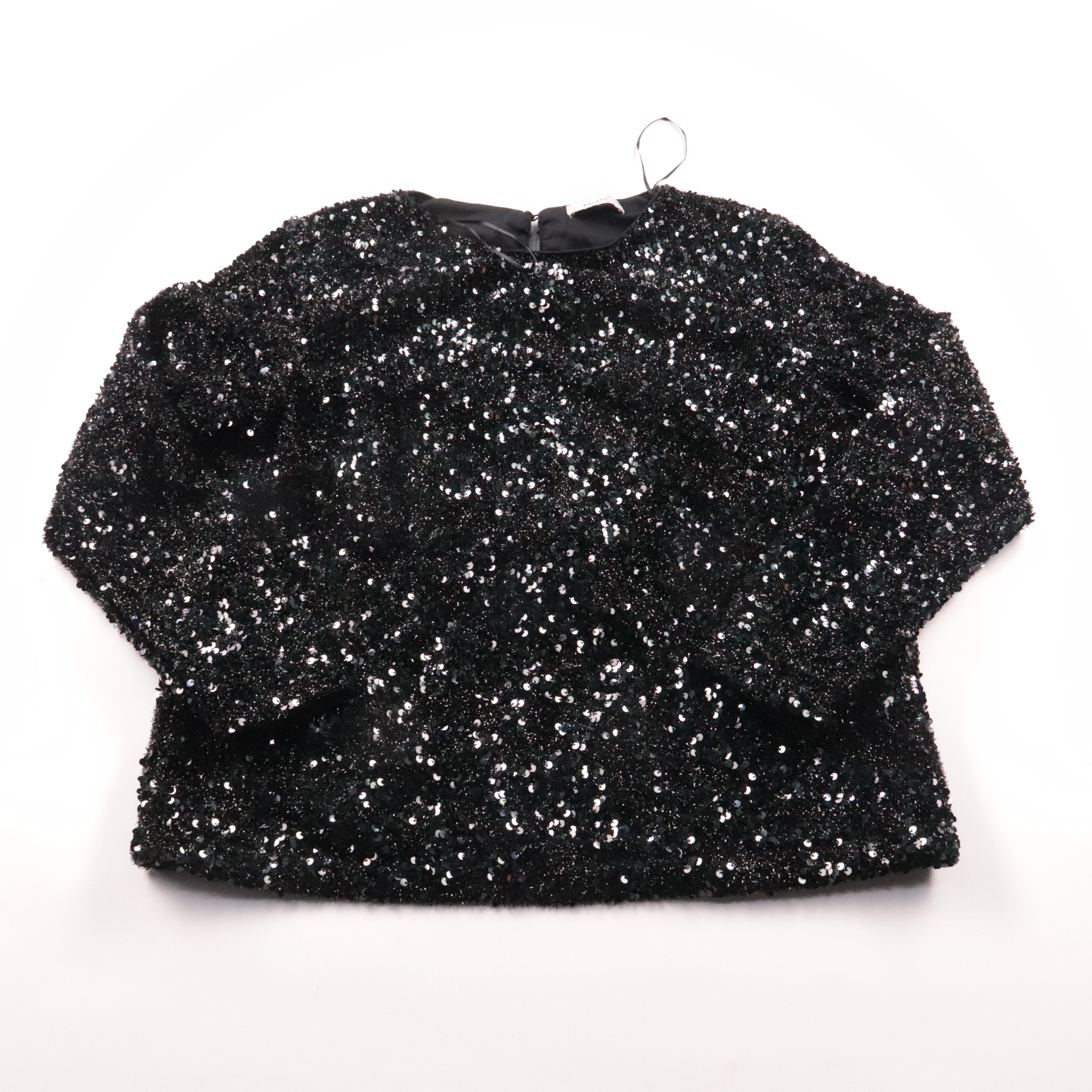 Футболка Per Una (M&S) чёрного цвета, полностью расшитая пайетками, с застёжкой на молнию сзади. Подойдёт для вечерних выходов и праздничных образов, хорошо смотрится с юбкой или брюками. Плотная подкладка делает вещь комфортнее в носке и помогает держ...