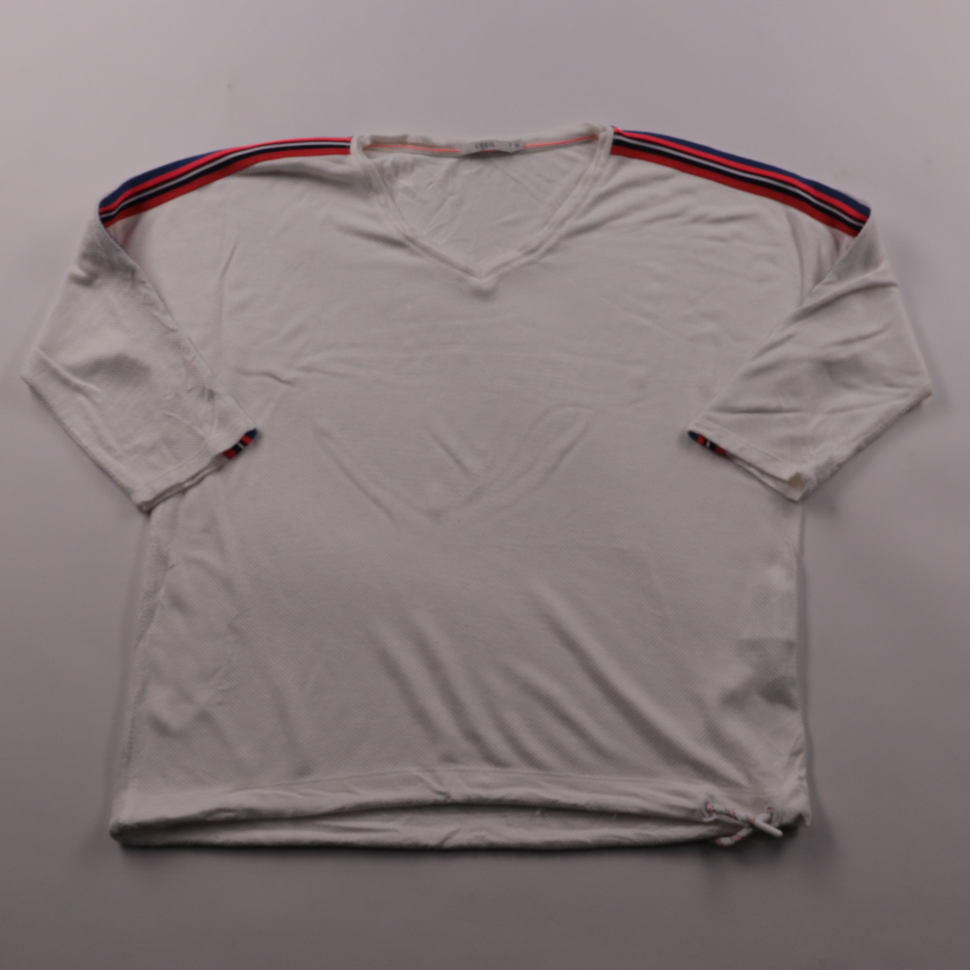 Белая футболка Cecil с V-образным вырезом и контрастными полосками на плечах и по низу рукавов. Подойдёт для повседневных образов и отдыха в тёплую погоду. Материал с вискозой приятный к телу и хорошо дышит.