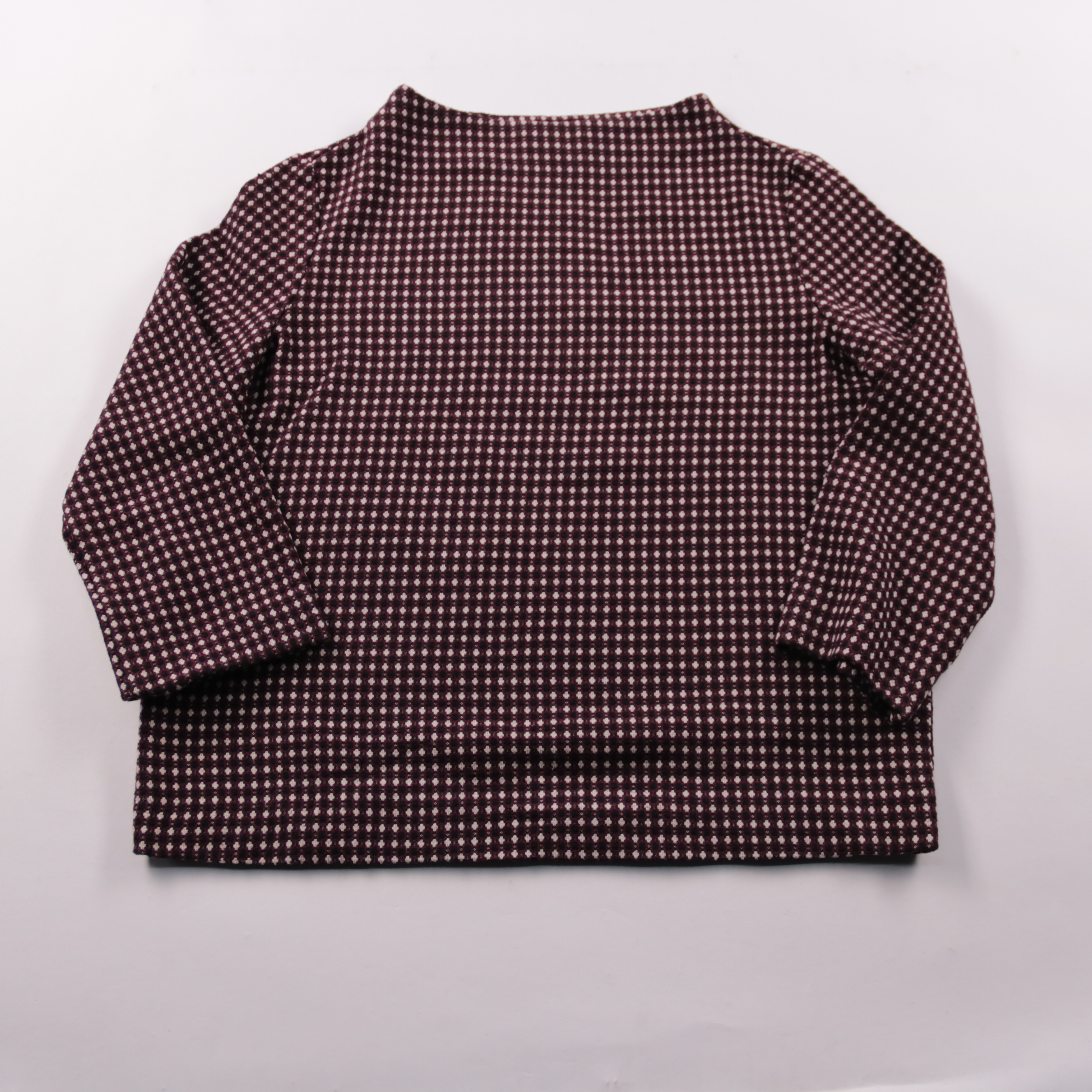 Лонгслив Opus из фактурного трикотажа с мелким геометрическим узором в бордово-черной гамме. Подойдет для повседневных образов с джинсами или брюками в офис без строгого дресс-кода. Плотная ткань держит форму и комфортна в носке.