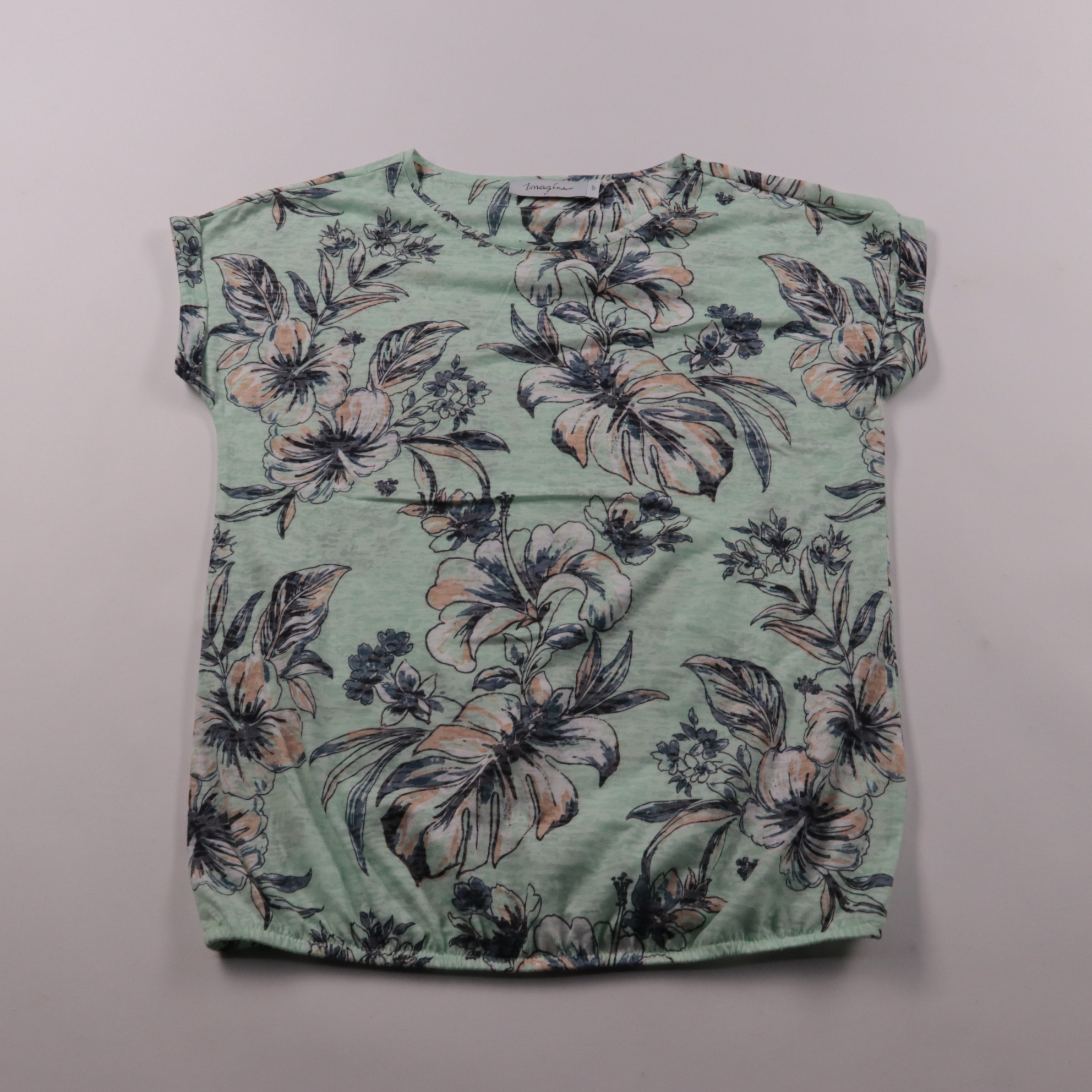 Футболка Imagine мятного цвета с крупным цветочным принтом и свободным прямым кроем. Подойдёт для повседневных летних образов и отдыха, хорошо смотрится с джинсами или шортами. Ткань лёгкая и почти не мнётся, удобно брать в поездки.