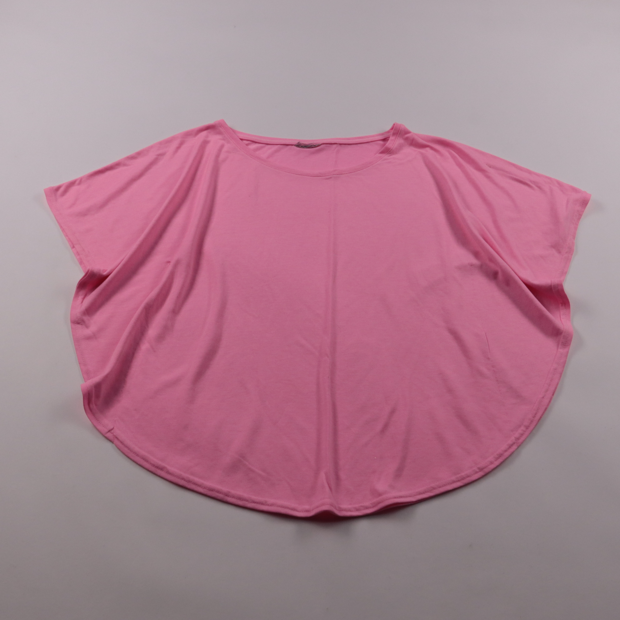 Розовая женская футболка свободного кроя с округлым вырезом и широкими рукавами. Подойдёт для повседневных летних образов и дома. Лёгкая ткань комфортно сидит и не стесняет движения.