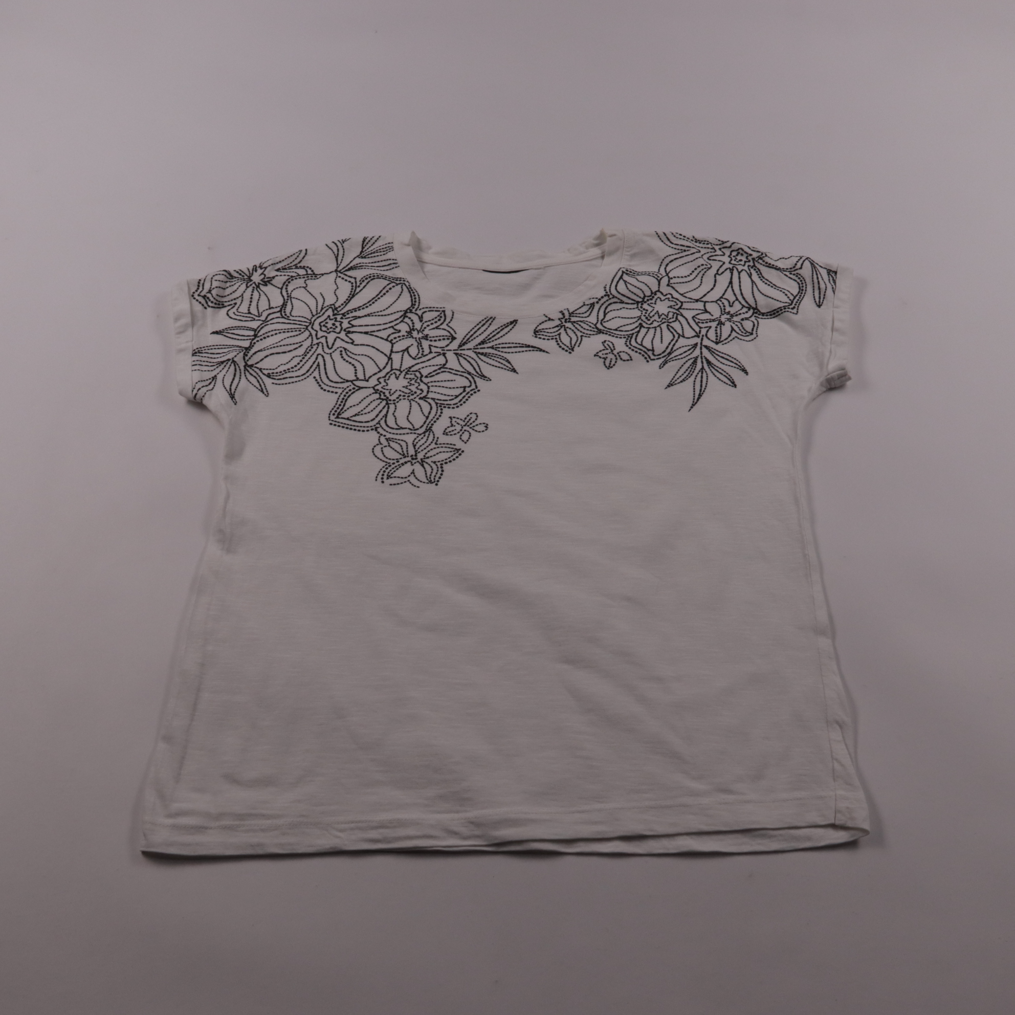 Женская белая футболка с черным цветочным принтом по линии плеч. Подойдёт для повседневных образов с джинсами, шортами или юбкой в тёплую погоду. Лёгкий материал комфортен в носке и легко сочетается с базовыми вещами.