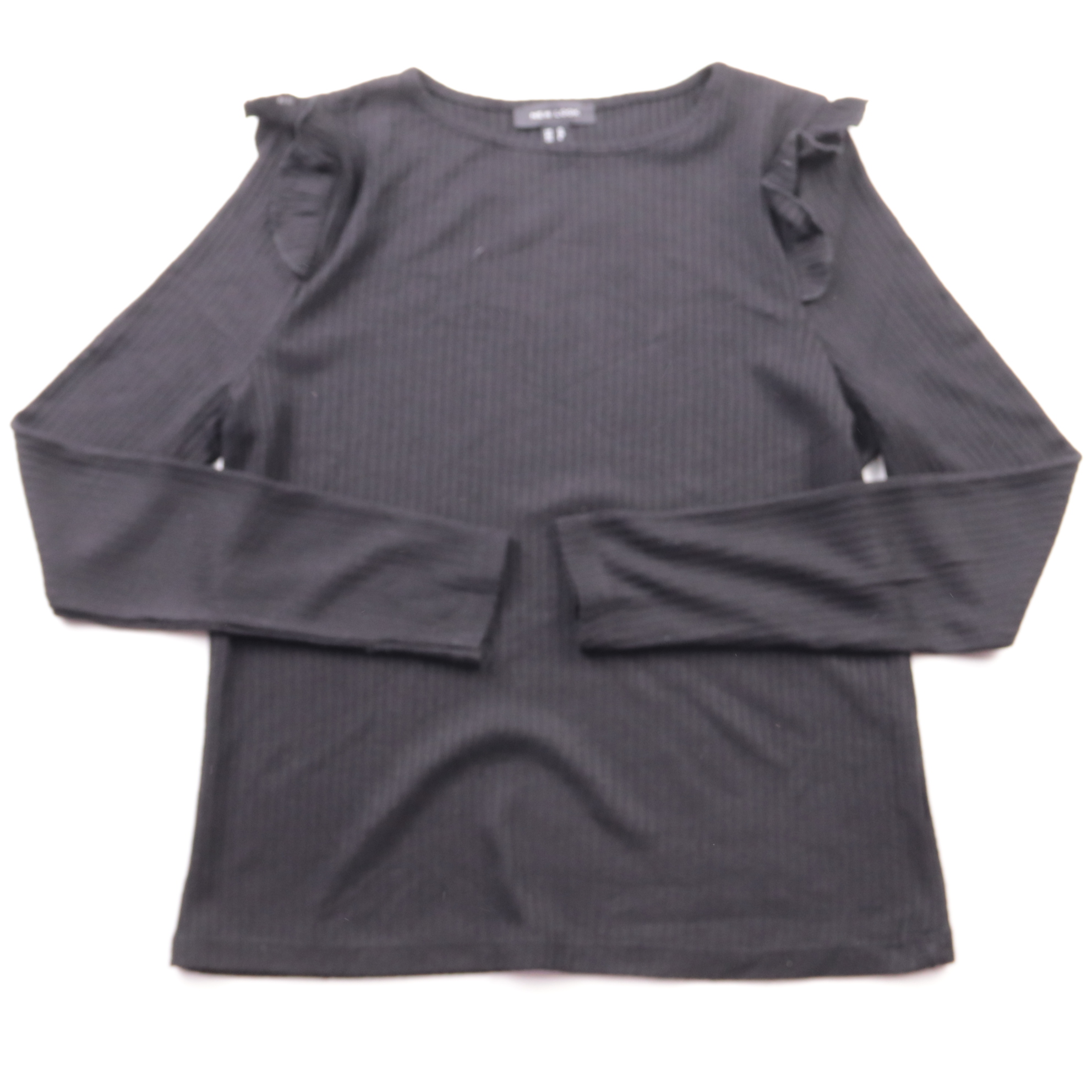Лонгслив New Look из чёрного трикотажа в рубчик с аккуратными воланами на плечах. Подойдёт для повседневных образов и офиса с жакетом или кардиганом. Материал тянется и комфортно садится по фигуре.