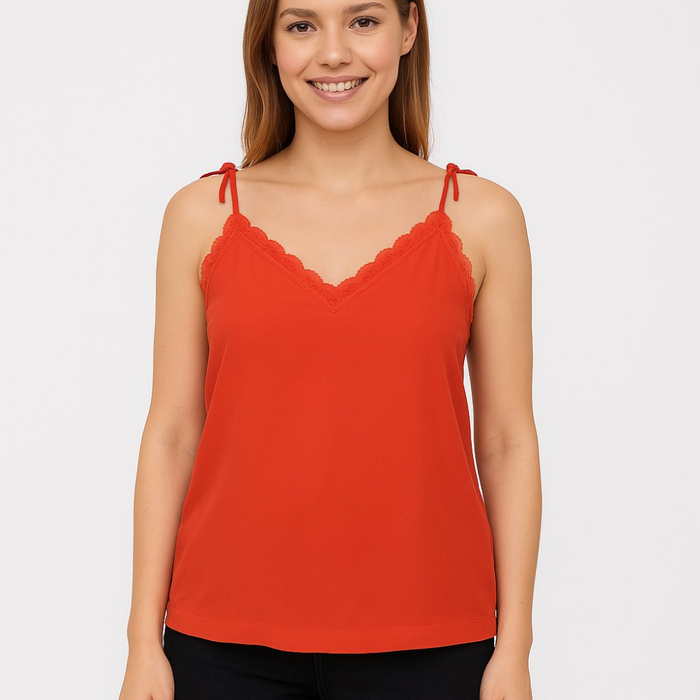 Топ Majolica красного цвета на тонких бретелях с завязками и кружевной отделкой по вырезу. Подойдёт для лета и тёплых дней, можно носить как самостоятельный верх или под жакет/кардиган. Лёгкая ткань и регулируемые бретели делают посадку удобной.