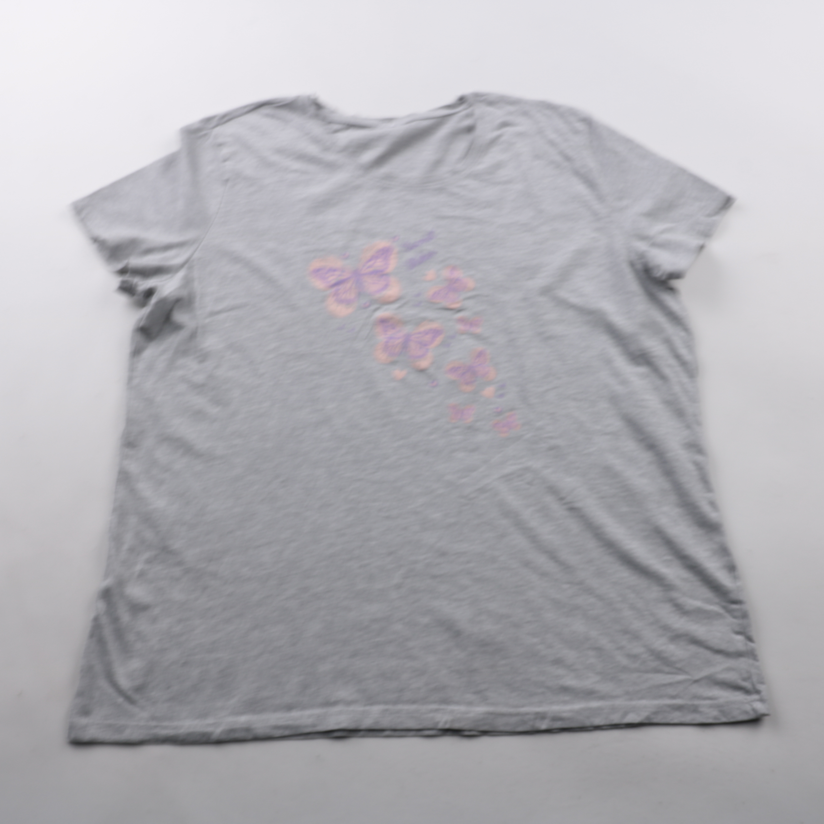 Женская серая футболка с небольшим принтом бабочек спереди. Подойдёт для повседневных образов и дома в тёплое время года или как базовый слой. Мягкая ткань и простой крой удобно сочетаются с джинсами и шортами.
