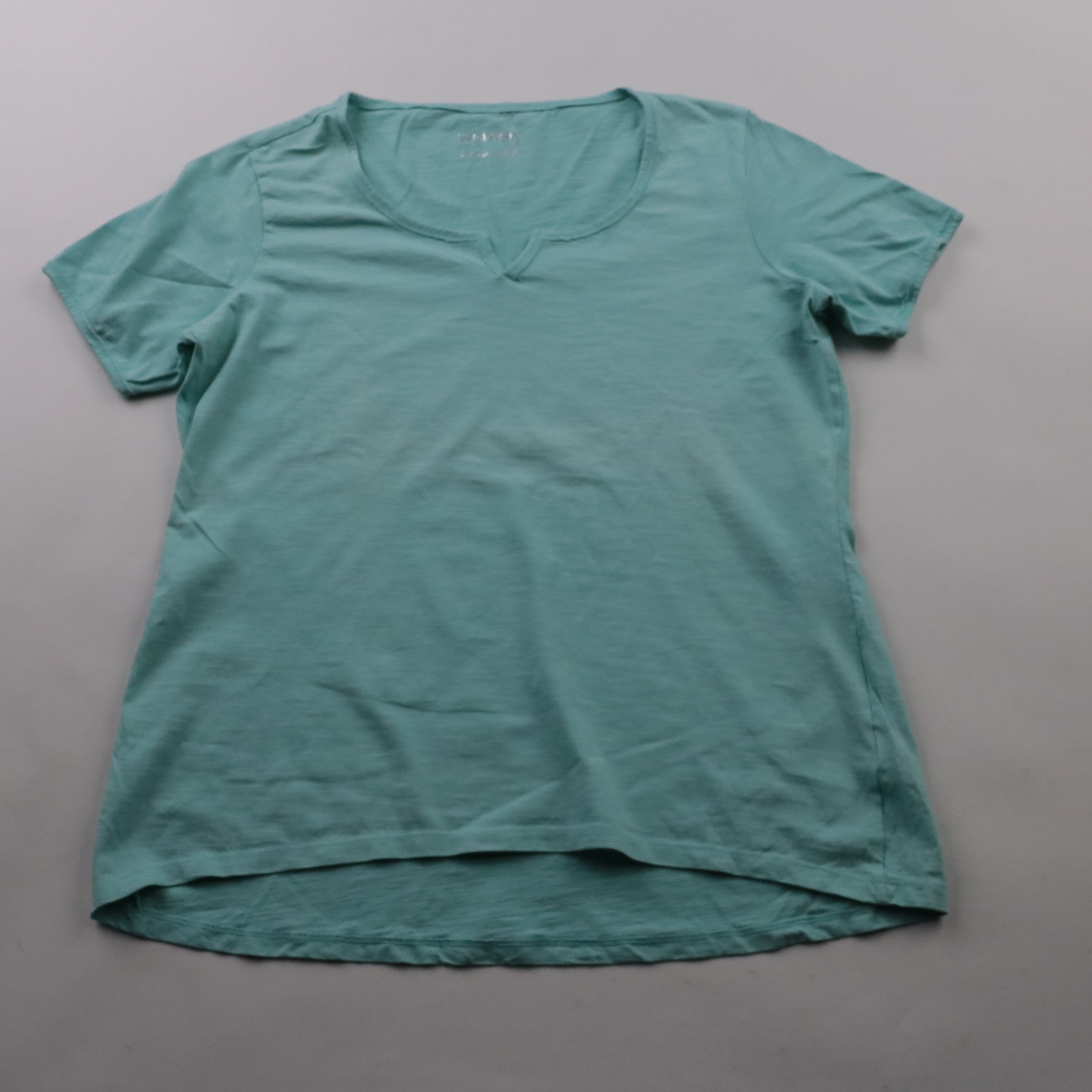 Женская футболка Tchibo (TCM) мятного цвета с коротким рукавом и круглым вырезом с небольшим разрезом. Подойдёт для повседневной носки летом, дома или на отдыхе. Натуральный хлопок приятен к телу и хорошо дышит.