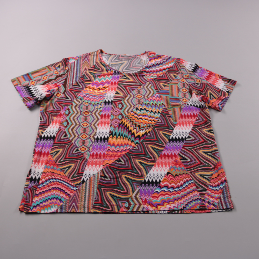 Женская футболка с ярким геометрическим принтом, мягкая и тянущаяся. Подойдёт для повседневных летних образов и отдыха, легко сочетается с однотонными низами. Практичный плюс — быстро сохнет и почти не мнётся благодаря полиэстеру.