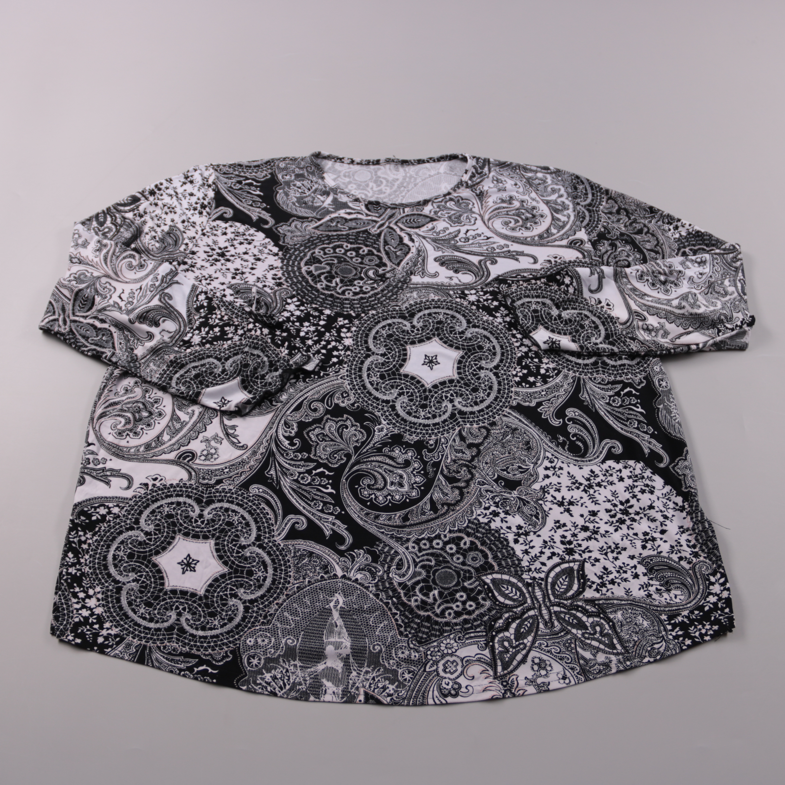 Женский лонгслив с длинным рукавом в черно-белом цвете и с орнаментальным принтом пейсли. Подойдет для повседневных образов и под жакет/кардиган в прохладную погоду. Практичный плюс — немаркая расцветка и легко сочетается с базовыми вещами.