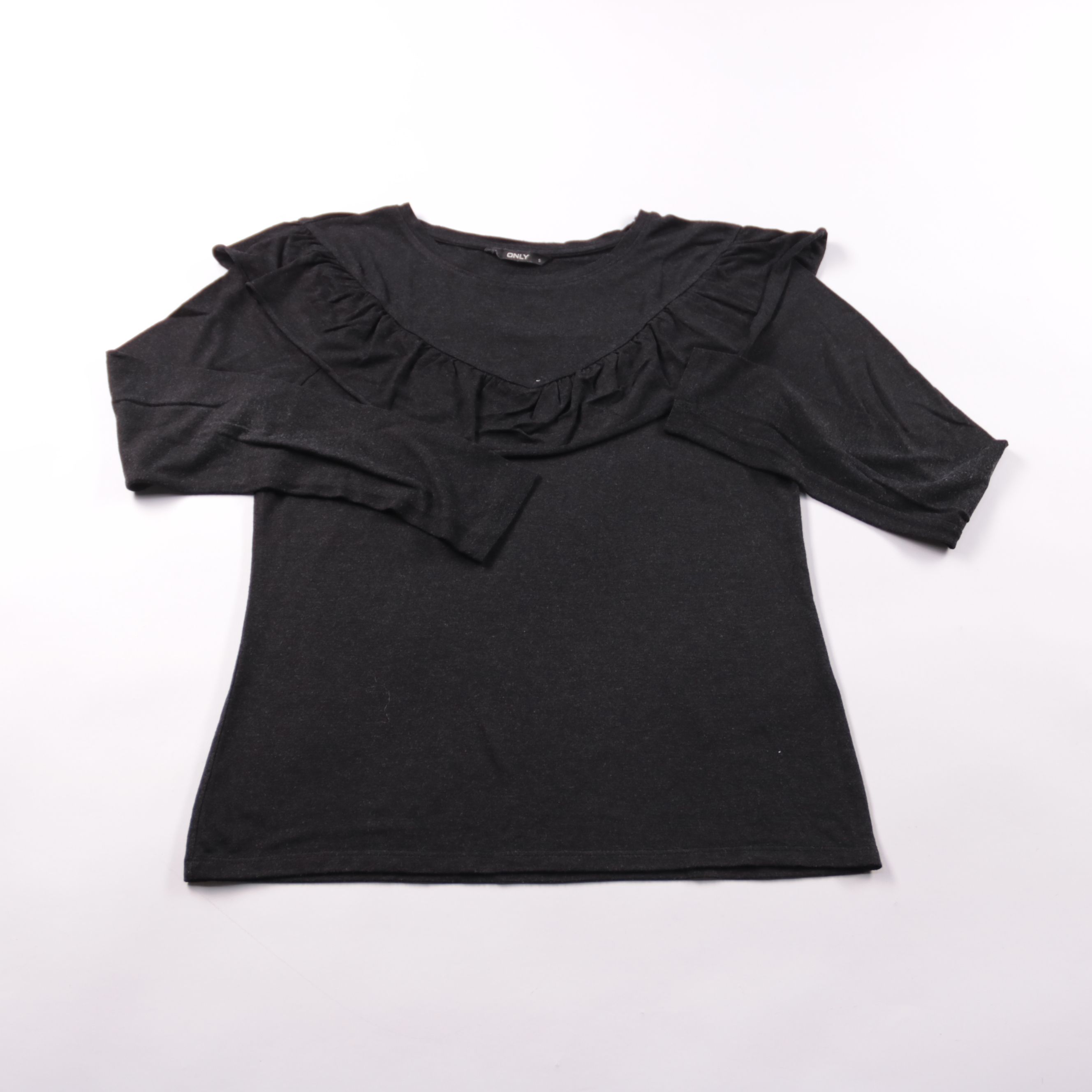 Женская футболка Only чёрного цвета с декоративной оборкой по линии выреза и рукавом 3/4. Подойдёт для повседневных образов и офиса в сочетании с джинсами или юбкой. Материал мягкий и тянется, поэтому удобно садится по фигуре.