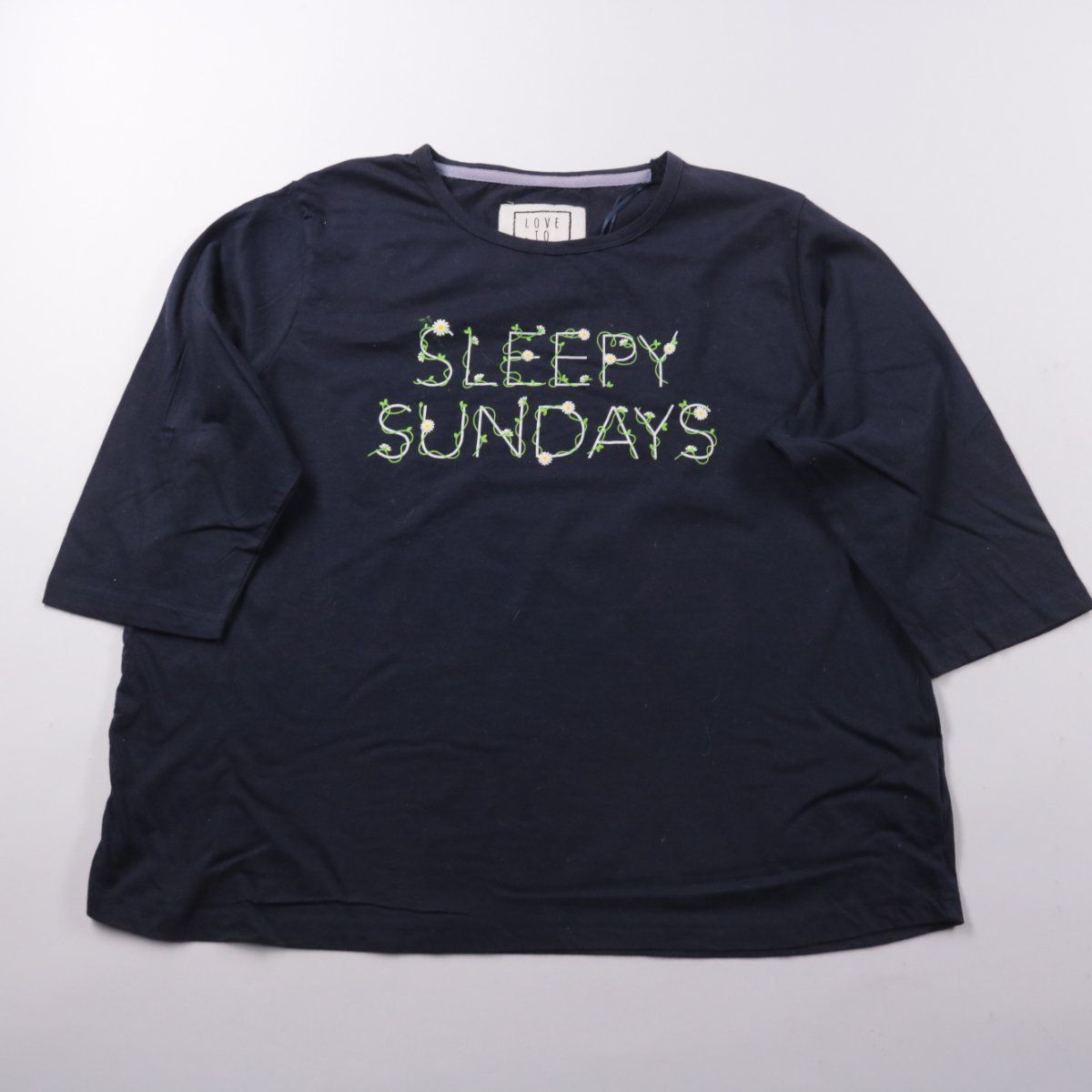 Женская футболка Love To Dream тёмно-синего цвета с принтом «SLEEPY SUNDAYS» и рукавом до локтя. Подойдёт для дома, сна и расслабленных повседневных образов. Натуральный хлопок приятен к телу и хорошо пропускает воздух.