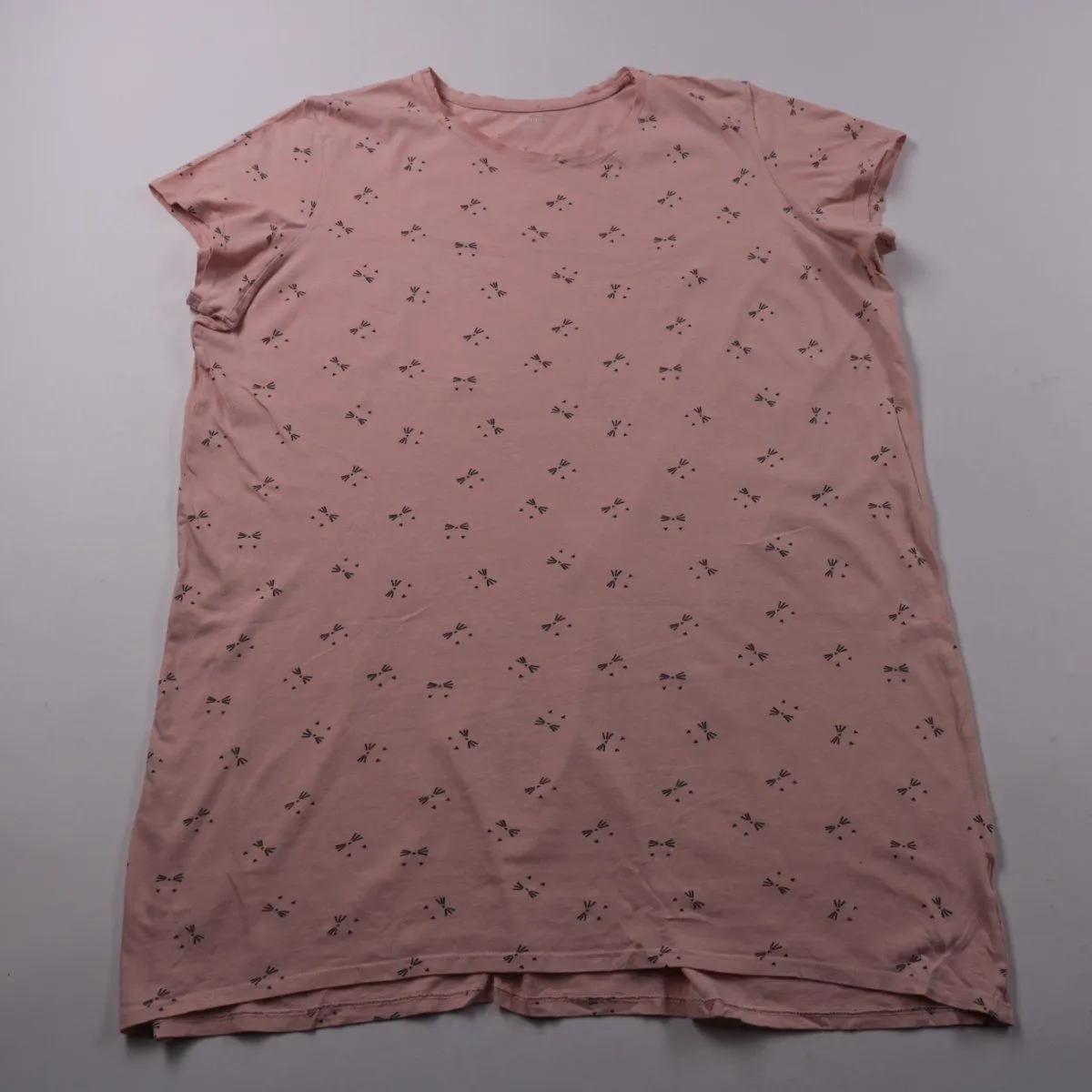 Женская футболка Kiabi нежно-розового цвета с мелким принтом. Подойдёт для повседневной носки дома или на прогулку в тёплую погоду, хорошо сочетается с джинсами и шортами. Лёгкий трикотажный материал удобно сидит и не сковывает движения.