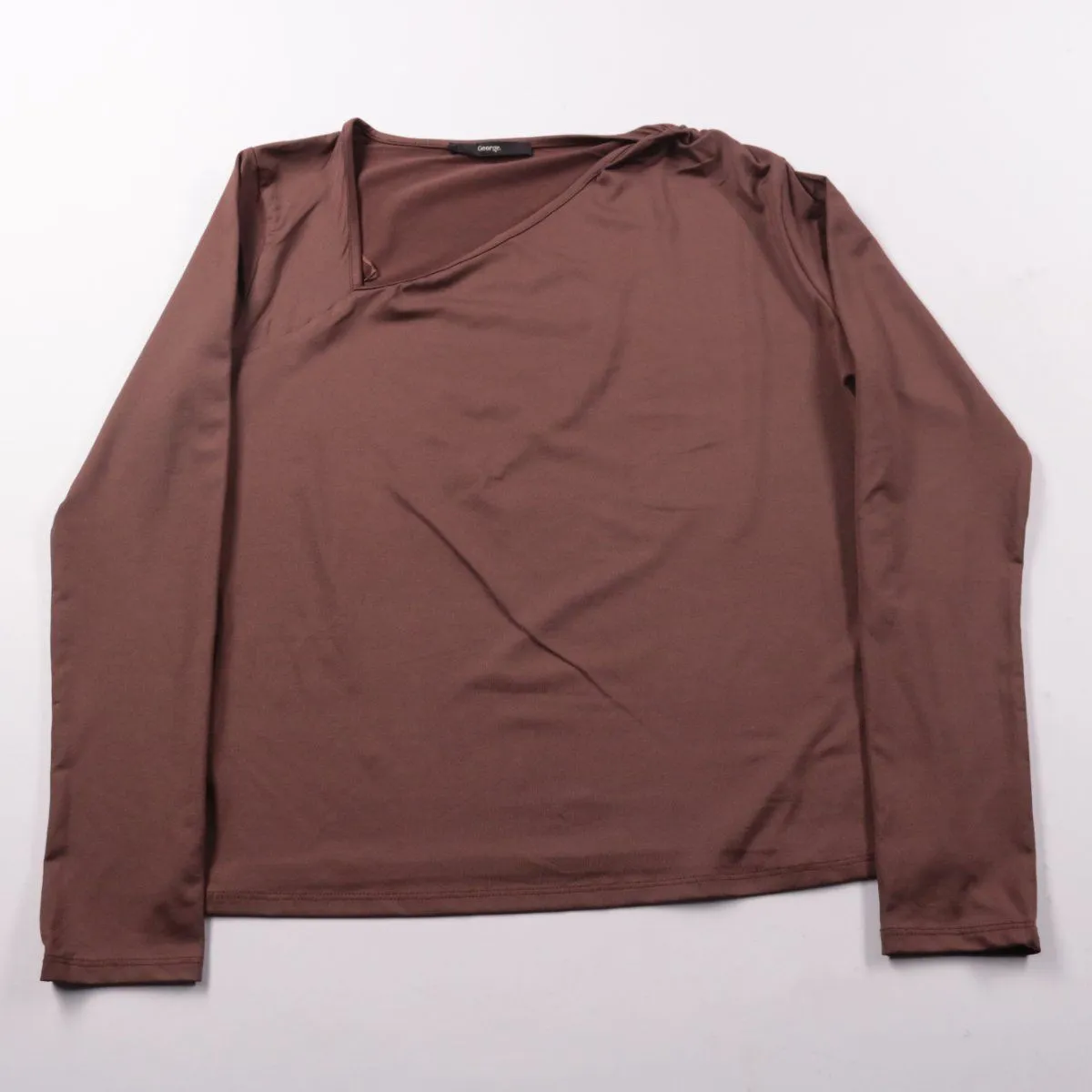 Женский лонгслив George шоколадного цвета с асимметричным V-образным вырезом. Подойдёт для повседневных образов и как базовый слой в прохладную погоду. Тянущийся материал хорошо садится по фигуре и не стесняет движений.