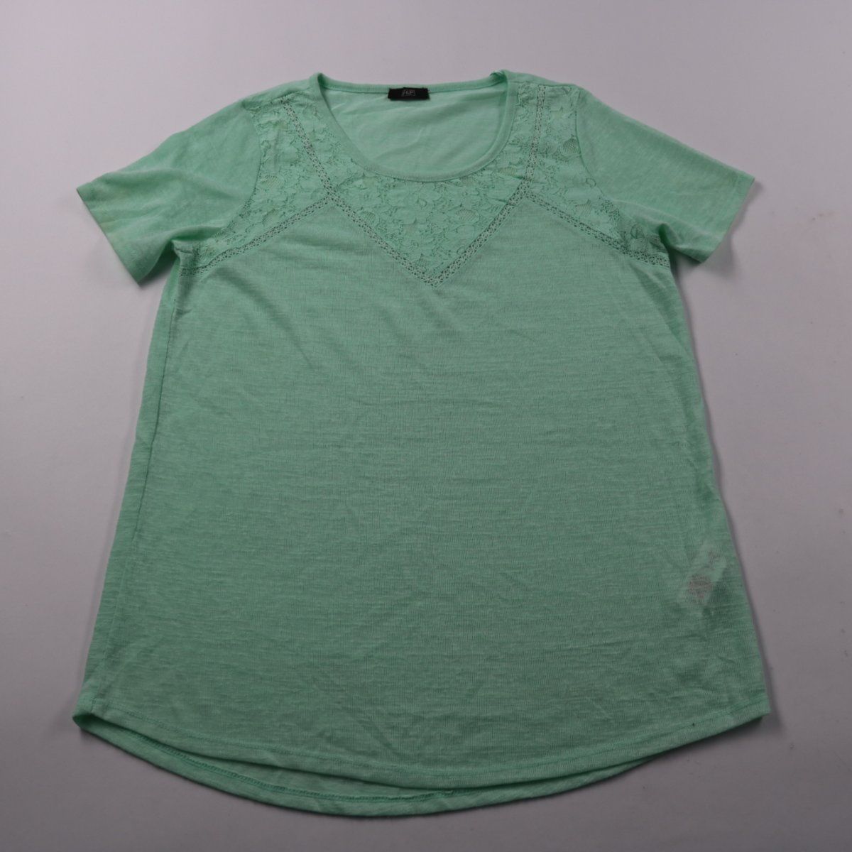 Женская футболка F&F мятного цвета с кружевной вставкой в зоне кокетки и округлым вырезом. Подойдёт для повседневных образов и на лето, а также как базовый слой под кардиган/жакет. Практична в уходе и легко сочетается с джинсами, шортами и юбками.