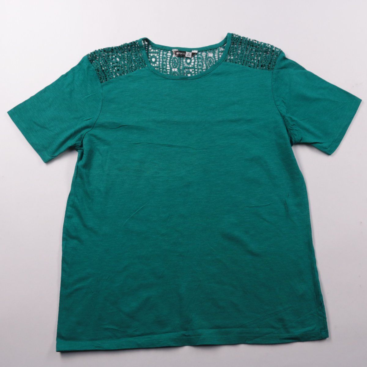 Женская футболка Pep&Co зелёного цвета с кружевными вставками на плечах и у горловины. Подойдёт для повседневных образов в тёплую погоду и для многослойных комплектов. Хлопковая основа хорошо дышит, а кружево добавляет аккуратный акцент.