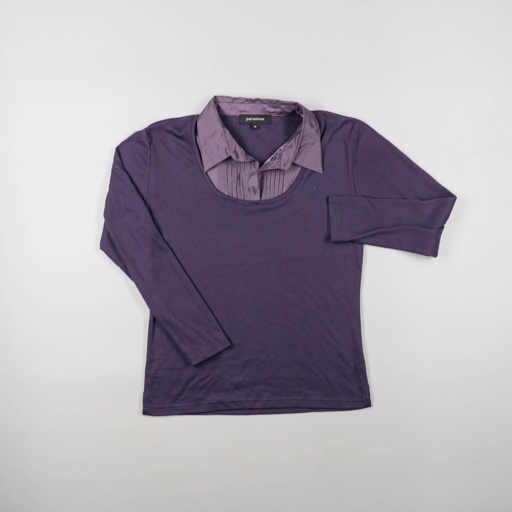 Женский лонгслив Paramour тёмно-фиолетового цвета с эффектом «рубашечного» воротника и декоративной планкой спереди. Подойдёт для офиса и повседневных образов, удобно носить как самостоятельный верх или под жакет. Практичный вариант для многослойности ...