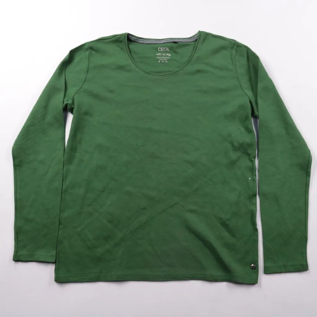 Женский лонгслив CECIL зелёного цвета из органического хлопка, с круглым вырезом и длинным рукавом. Подойдёт для повседневных образов и как базовый слой в прохладную погоду. Практичный плюс — натуральный дышащий материал комфортен в течение дня.