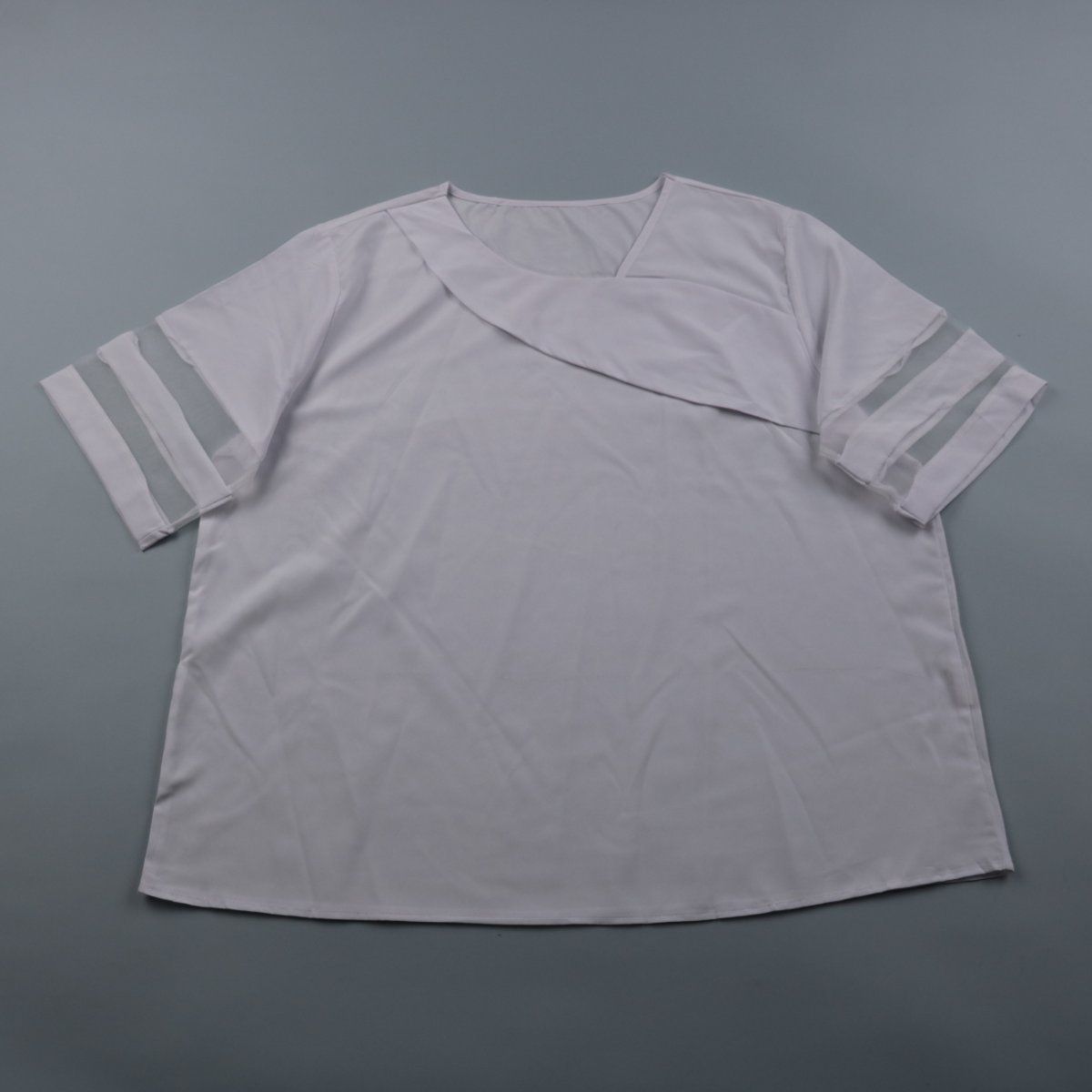 Женский белый топ из полиэстера с асимметричным вырезом и декоративной планкой спереди. Подойдёт для повседневных образов и офиса в тёплую погоду, хорошо сочетается с брюками и юбками. Практичное преимущество: материал почти не мнётся и быстро сохнет.