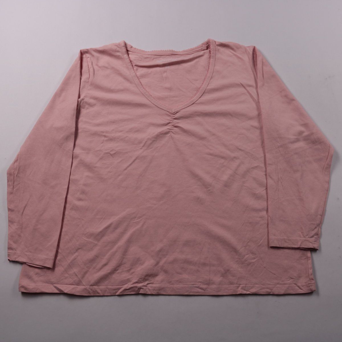 Женский лонгслив Dunnes Stores из мягкого хлопка в нежно-розовом цвете, с V-образным вырезом и небольшой сборкой по центру груди. Подойдёт для повседневной носки и в качестве базового слоя в прохладную погоду. Натуральный материал хорошо пропускает воздух и комфортен к телу.