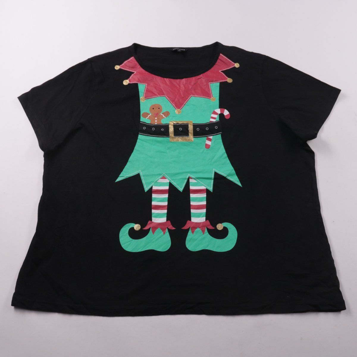 Женская футболка Peacocks чёрного цвета с ярким принтом в тематике новогоднего эльфа. Подойдёт для повседневных образов и праздничных мероприятий. Хлопковый материал хорошо пропускает воздух и комфортен в носке.
