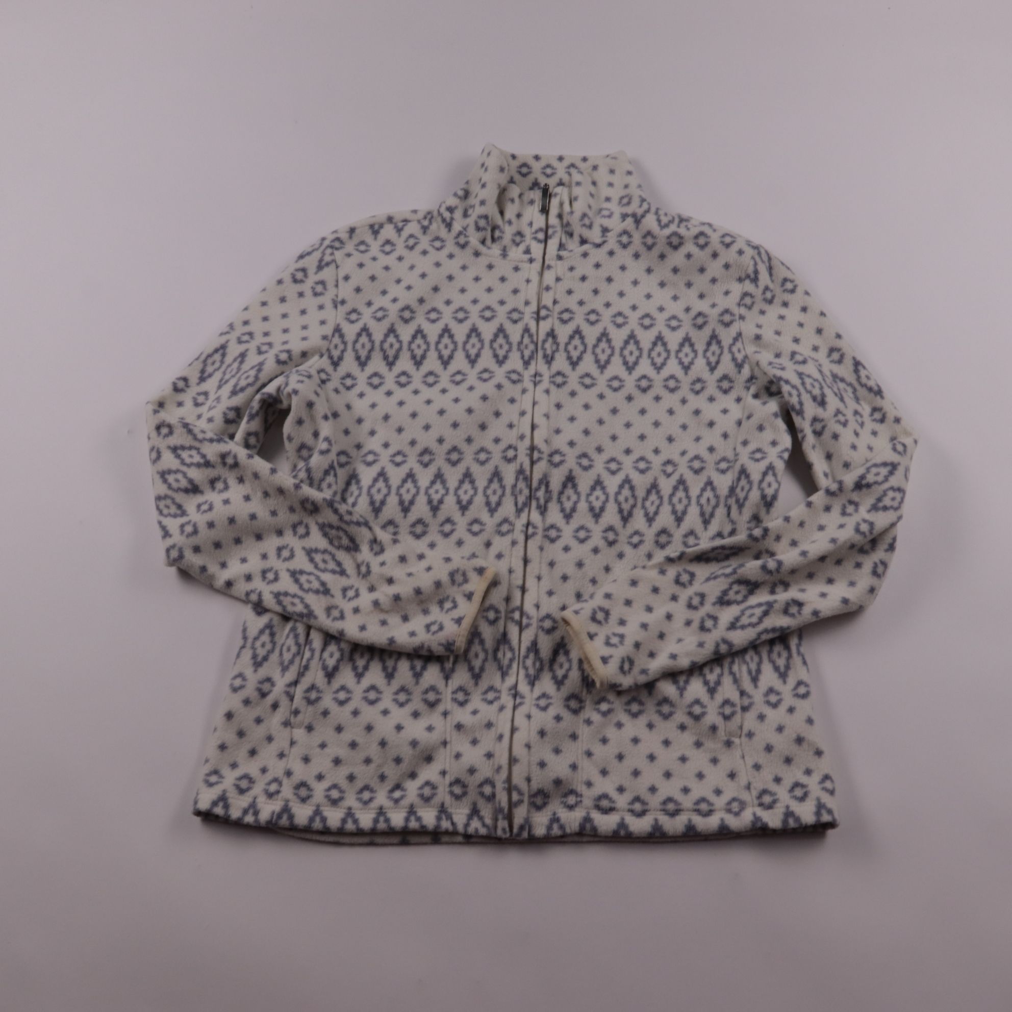Лёгкая флисовая куртка Esmara на молнии с высоким воротником и серо-голубым геометрическим принтом. Подойдёт для прогулок и поездок в прохладную погоду как второй слой. Флис быстро сохнет и прост в уходе.