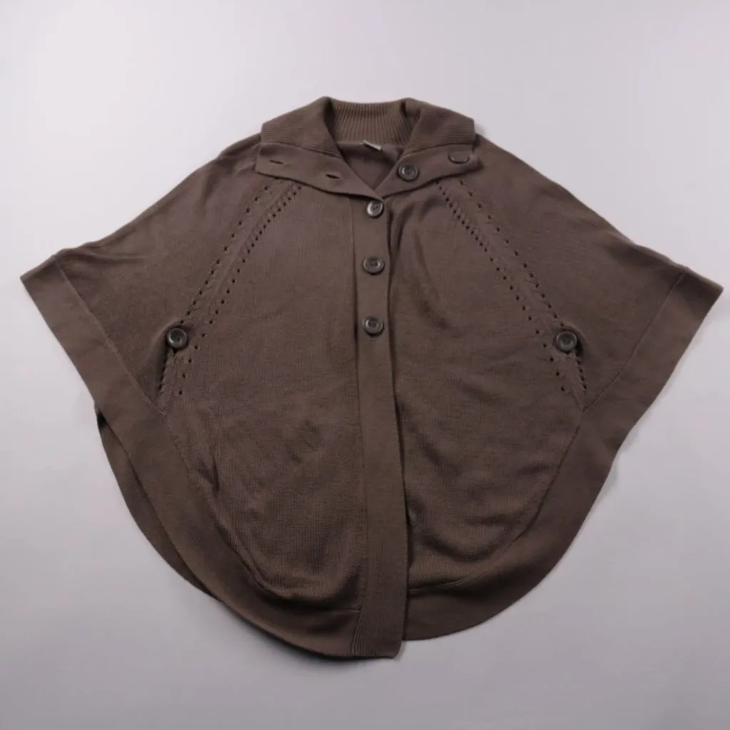 Вязаное пончо M&S коричневого цвета с застёжкой на пуговицы и отложным воротником. Подойдёт для демисезона и многослойных образов поверх водолазок и лонгсливов. Практично тем, что не стесняет движений и быстро накидывается как накидка.