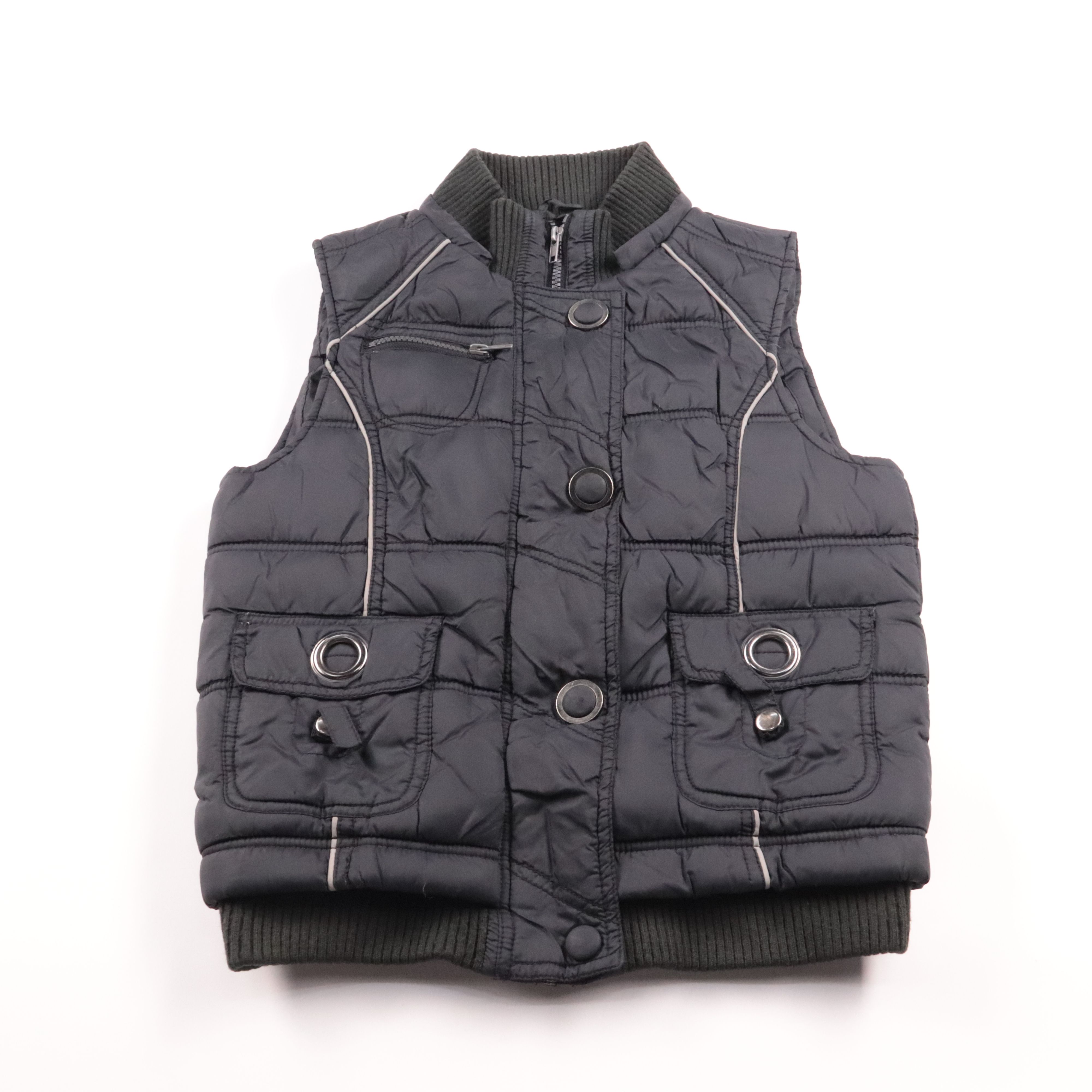Стёганый утеплённый жилет Amisu тёмно-серого/графитового цвета с воротником-стойкой и застёжкой на молнию и кнопки. Подойдёт для прохладной весны и осени, удобно носить поверх худи или свитера. Практичные карманы и плотные трикотажные манжеты по низу и...