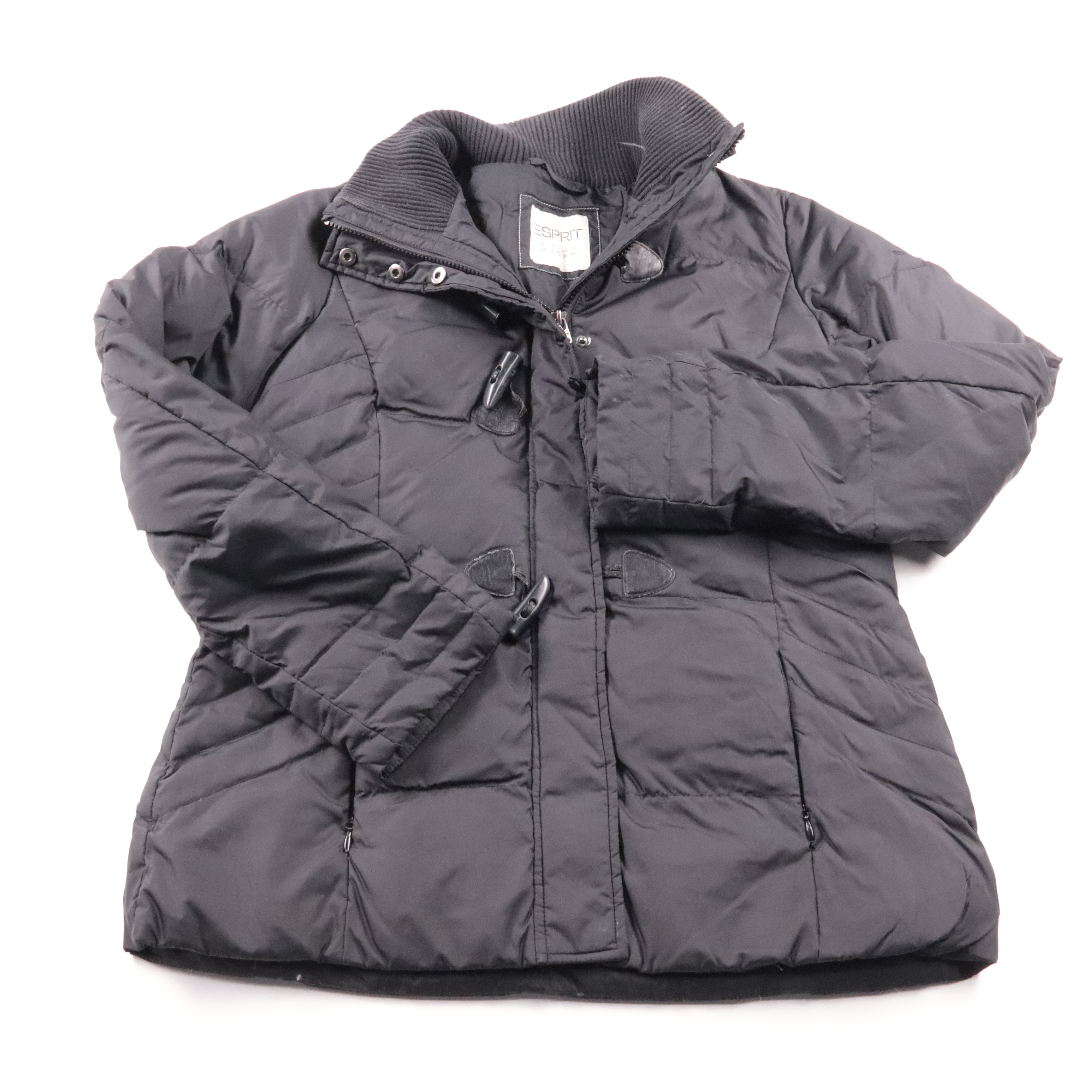 Женский пуховик Esprit чёрного цвета с высоким трикотажным воротником и застёжкой на молнию/клапан с фиксаторами. Подойдёт для зимних прогулок и повседневной носки в городе, хорошо сочетается с джинсами и тёплыми ботинками. Практичный плюс — тёплая пух...