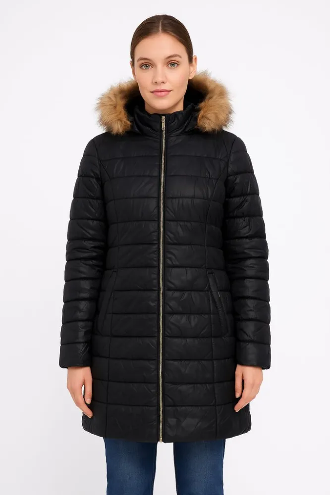 Женский пуховик Gaudi Jeans чёрного цвета с капюшоном и отделкой из экомеха. Подойдёт для зимних прогулок и повседневной носки в городе. Утеплённая стёжка хорошо держит тепло, а застёжка на молнии удобна в носке.