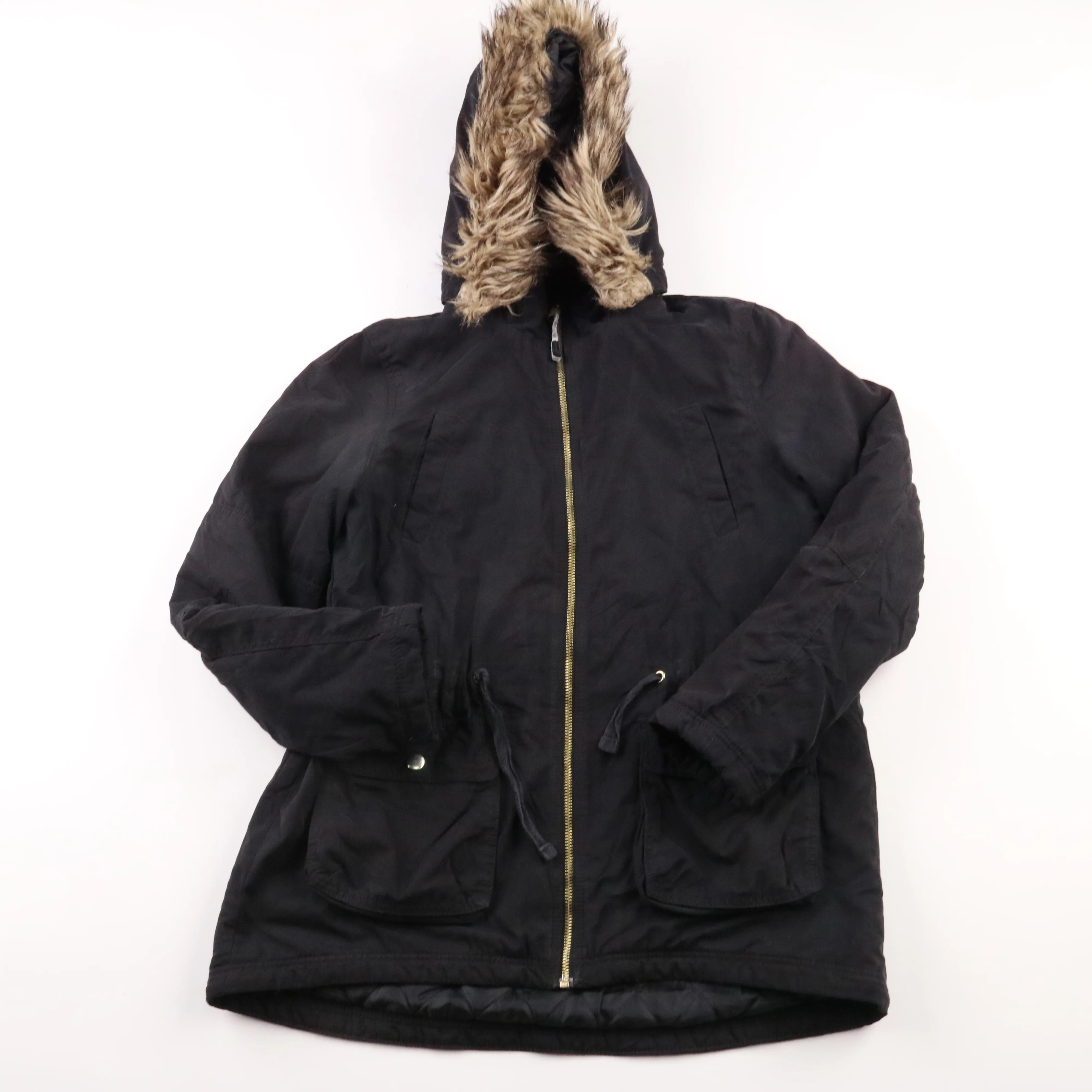Зимняя куртка H&M чёрного цвета с капюшоном и отделкой под мех. Подойдёт для повседневной носки в холодную погоду и прогулок по городу. Практичный плюс — тёплая стёганая подкладка и удобная молния по всей длине.