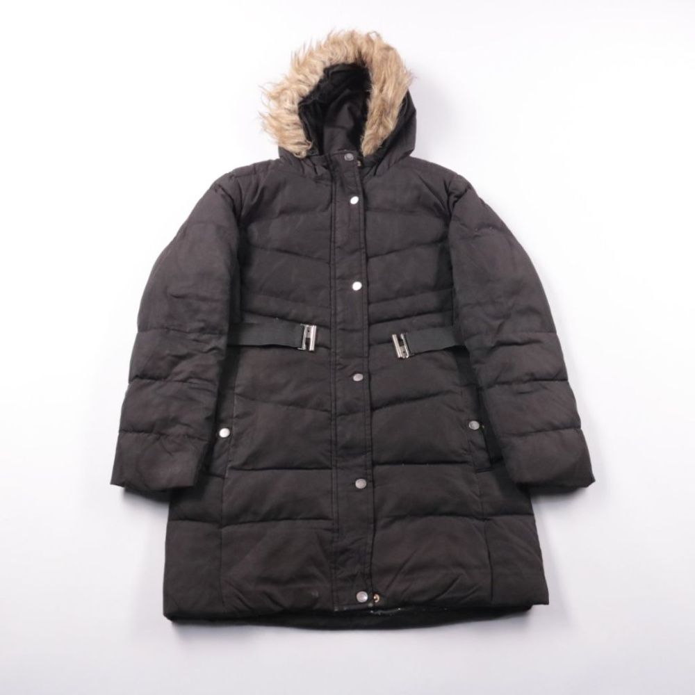 Женский пуховик Mango чёрного цвета с капюшоном и опушкой. Подойдёт для зимних прогулок и поездок по городу, есть поясные ремешки для более приталенной посадки. Практичный вариант: тёплая стёганая модель на кнопках, легко сочетать с повседневной одеждой.