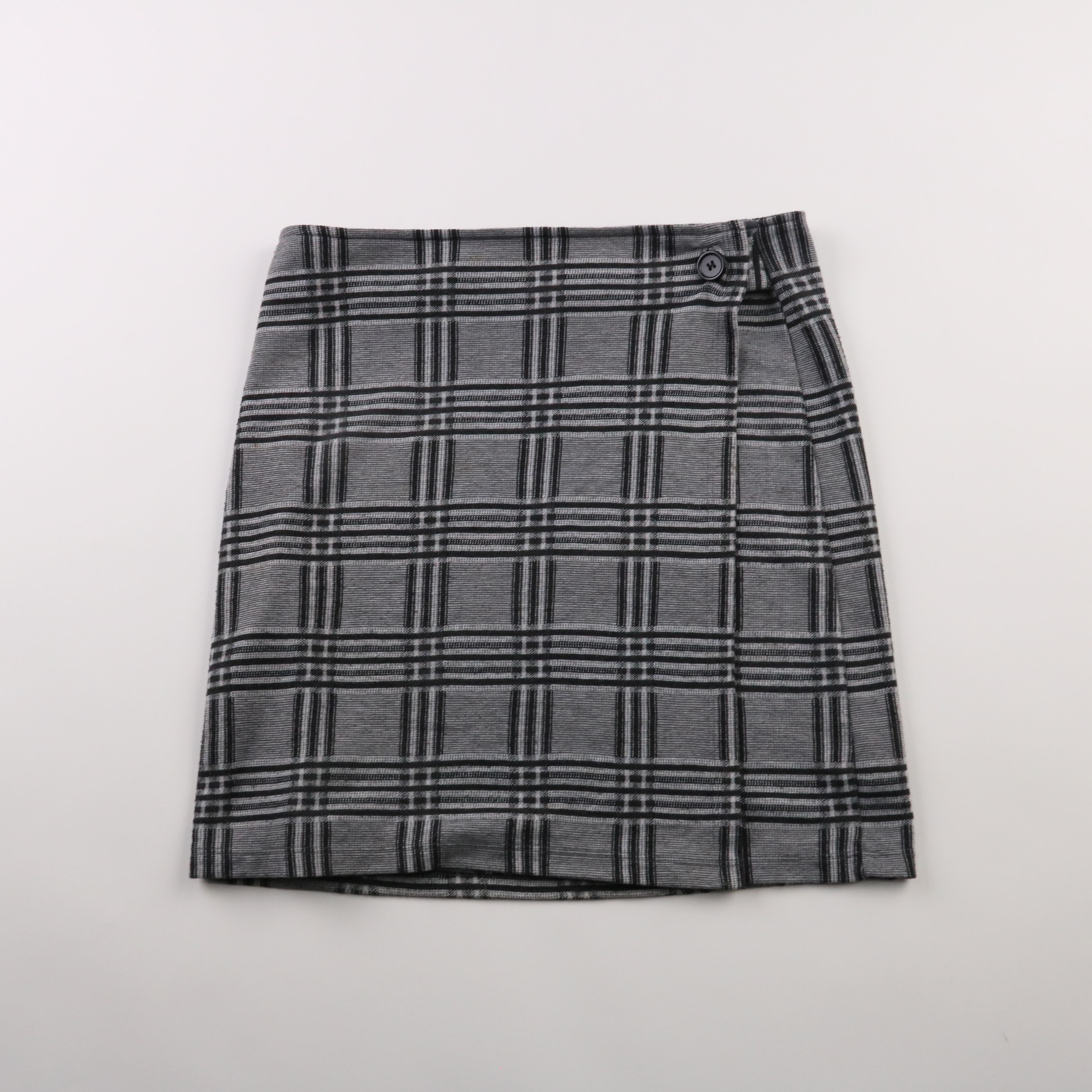Юбка Zero в серо-чёрную клетку, короткая, с запахом и застёжкой на пуговицу сбоку. Подойдёт для офиса и повседневных образов в демисезон. Плотная ткань держит форму и легко сочетается с базовыми свитерами и рубашками.