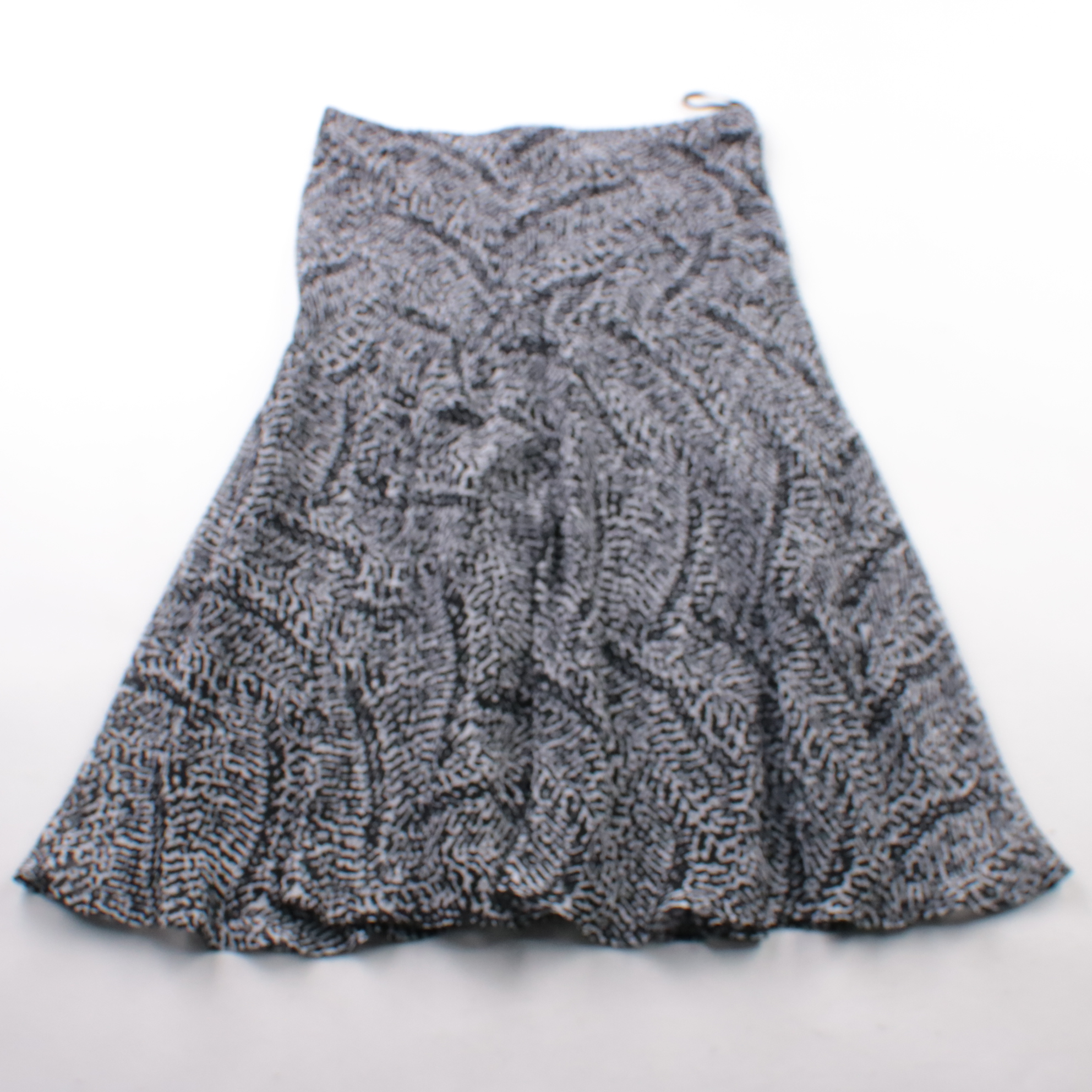 Юбка M&S с чёрно-белым абстрактным принтом и расклёшенным силуэтом. Подойдёт для повседневных образов и офиса в сочетании с однотонным верхом. Лёгкая ткань и подкладка из полиэстера делают её практичной в уходе и носке.