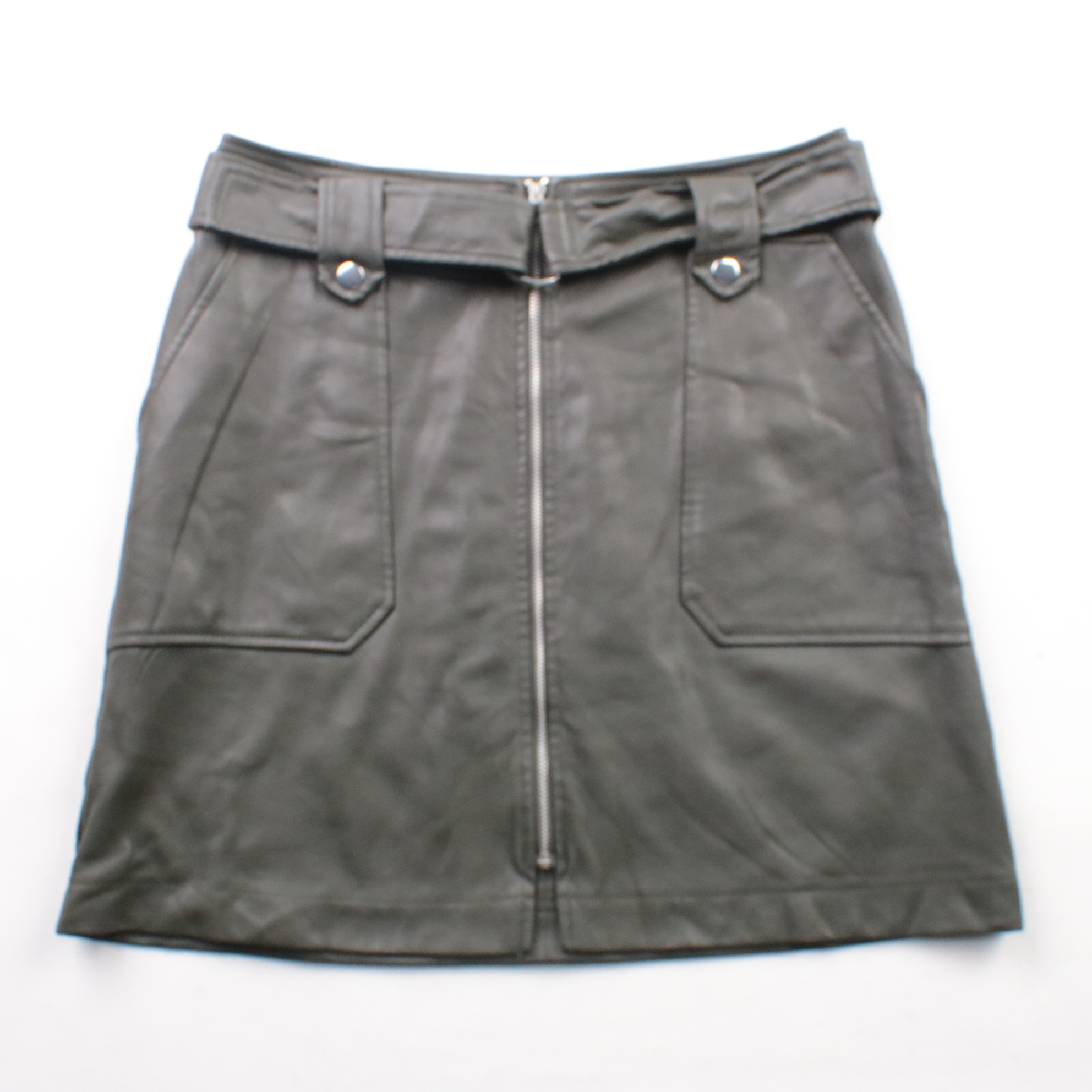 Юбка Primark из экокожи (полиуретан) в тёмно-зелёном оттенке, спереди молния и накладные карманы. Подойдёт для повседневных образов в городе в прохладную погоду. Материал не продувается и легко протирается.