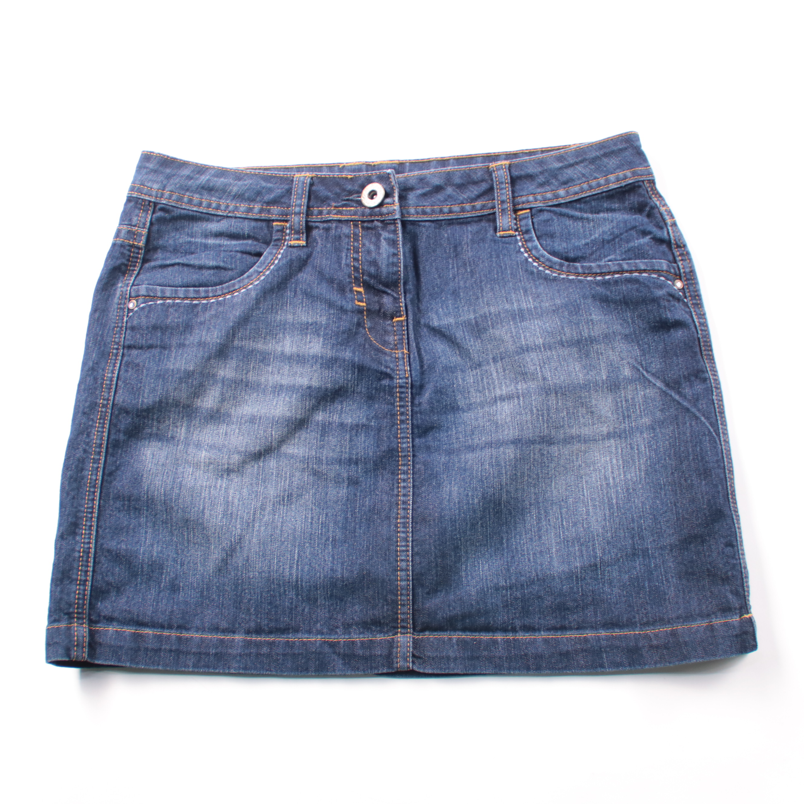 Джинсовая юбка George из денима тёмно-синего цвета с контрастной прострочкой и карманами. Подойдёт для повседневных летних образов с футболками и рубашками, а также для прогулок. Практичный плюс — плотный материал и удобная посадка на поясе с застёжкой...