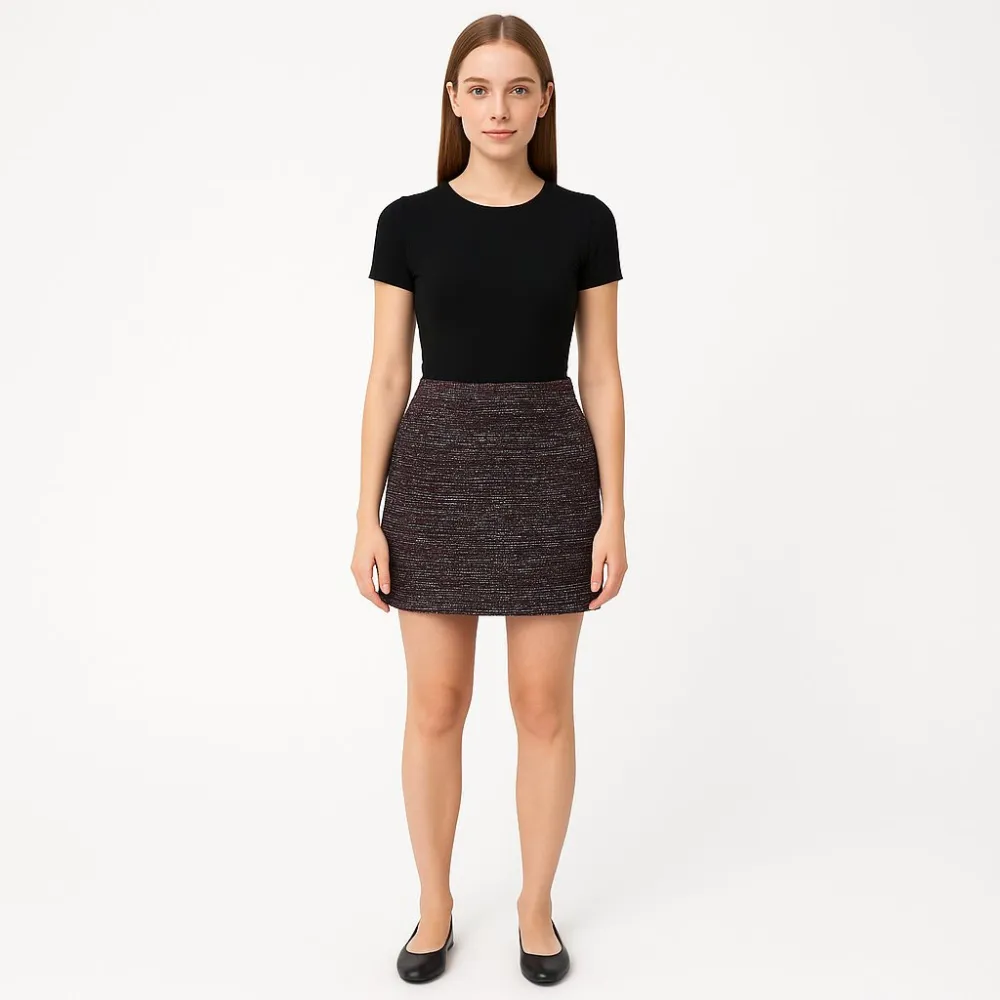 Юбка Orsay прямого мини-кроя из фактурной твидовой ткани в чёрно-бордовой гамме с лёгким блеском. Подойдёт для офиса и повседневных образов с базовыми топами и жакетами. Плотный материал хорошо держит форму и комфортно сидит по фигуре.