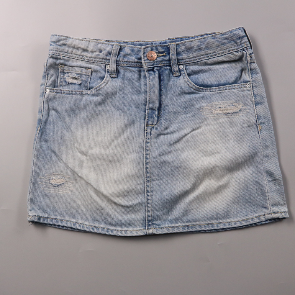 Джинсовая юбка H&M из светлого денима с потертостями и классической посадкой на талии. Подойдёт для летних образов с футболкой или рубашкой и кедами/сандалиями. Плотный хлопок хорошо держит форму и легко стирается.