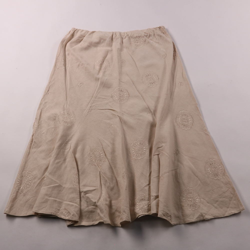 Льняная юбка с добавлением вискозы, с вышитым цветочным узором и мягкой посадкой на талии. Подойдёт для повседневных образов летом и в тёплую погоду, хорошо сочетается с однотонными топами и рубашками. Материал дышит и приятен к телу.