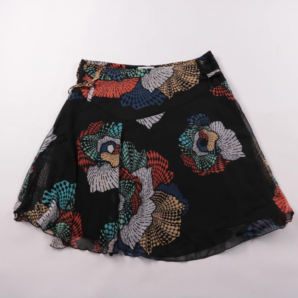 Лёгкая женская юбка Yessica из полупрозрачного полиэстера с ярким разноцветным принтом на чёрном фоне. Подойдёт для лета и отдыха, хорошо смотрится с однотонными топами и футболками. Ткань почти не мнётся и быстро сохнет.