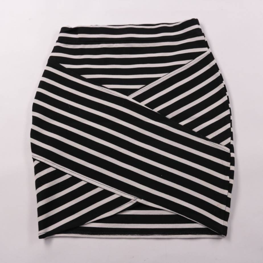 Юбка Coolcat в чёрно-белую полоску с эффектом запаха и перекрёстными деталями спереди. Подойдёт для повседневных образов и на выход, легко сочетается с однотонным верхом. Эластичный материал хорошо тянется и комфортно садится по фигуре.