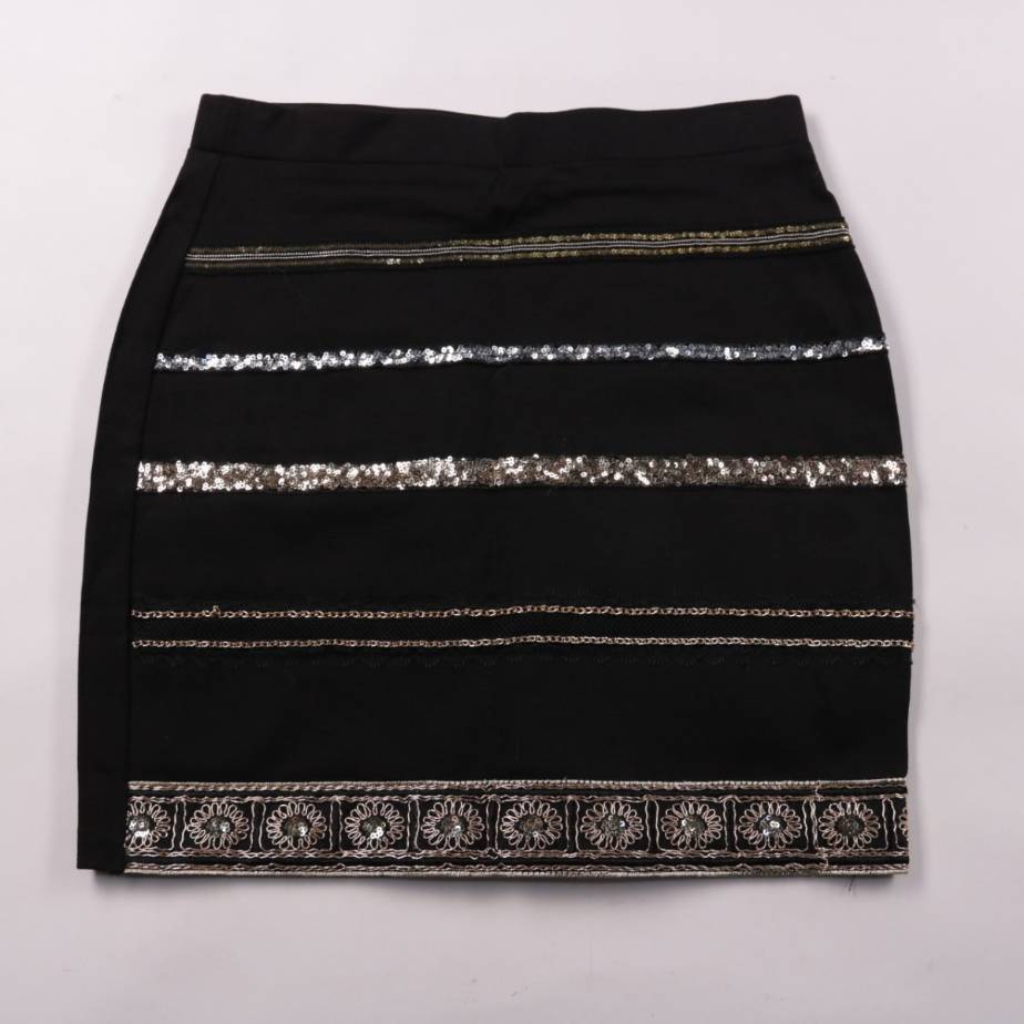 Юбка Miss One чёрного цвета с декоративными полосами из пайеток и вышивкой по низу. Подойдёт для вечерних выходов и аккуратных повседневных образов с однотонным верхом. Эластичная ткань хорошо садится по фигуре и не стесняет движения.