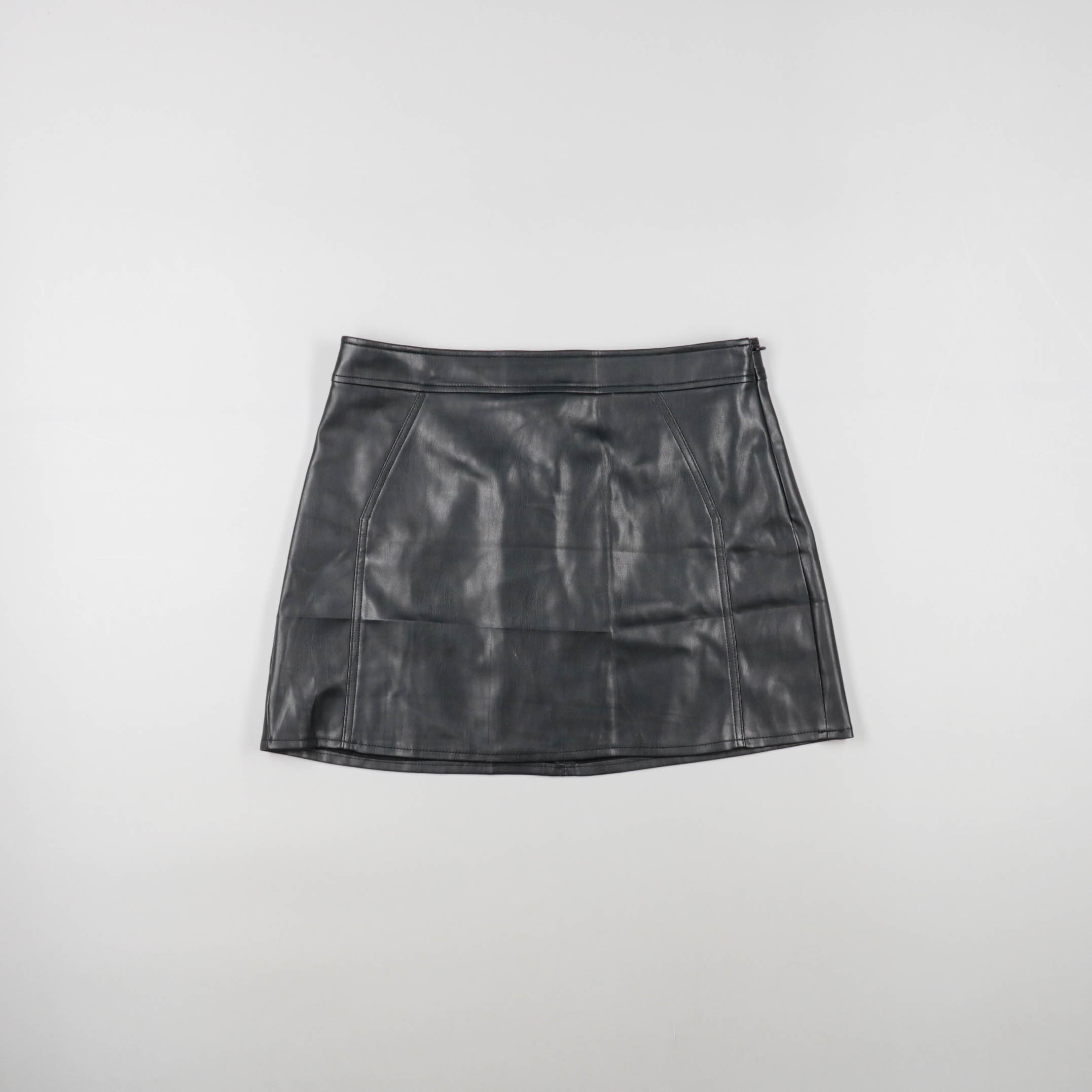 Чёрная мини-юбка из экокожи с лёгким блеском и декоративными швами. Подойдёт для повседневных образов и вечерних выходов с топом или свитером. Материал практичный — легко протирается и не требует сложного ухода.