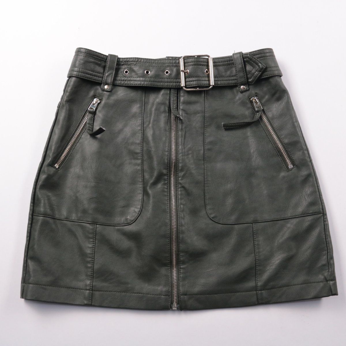 Кожаная юбка Topshop тёмно‑зелёного цвета с поясом и центральной молнией, карманы оформлены молниями. Подойдёт для повседневных образов в межсезонье — с ботинками или кедами и базовым верхом. Практичный плюс: плотный материал и функциональные застёжки, удобно носить и сочетать.